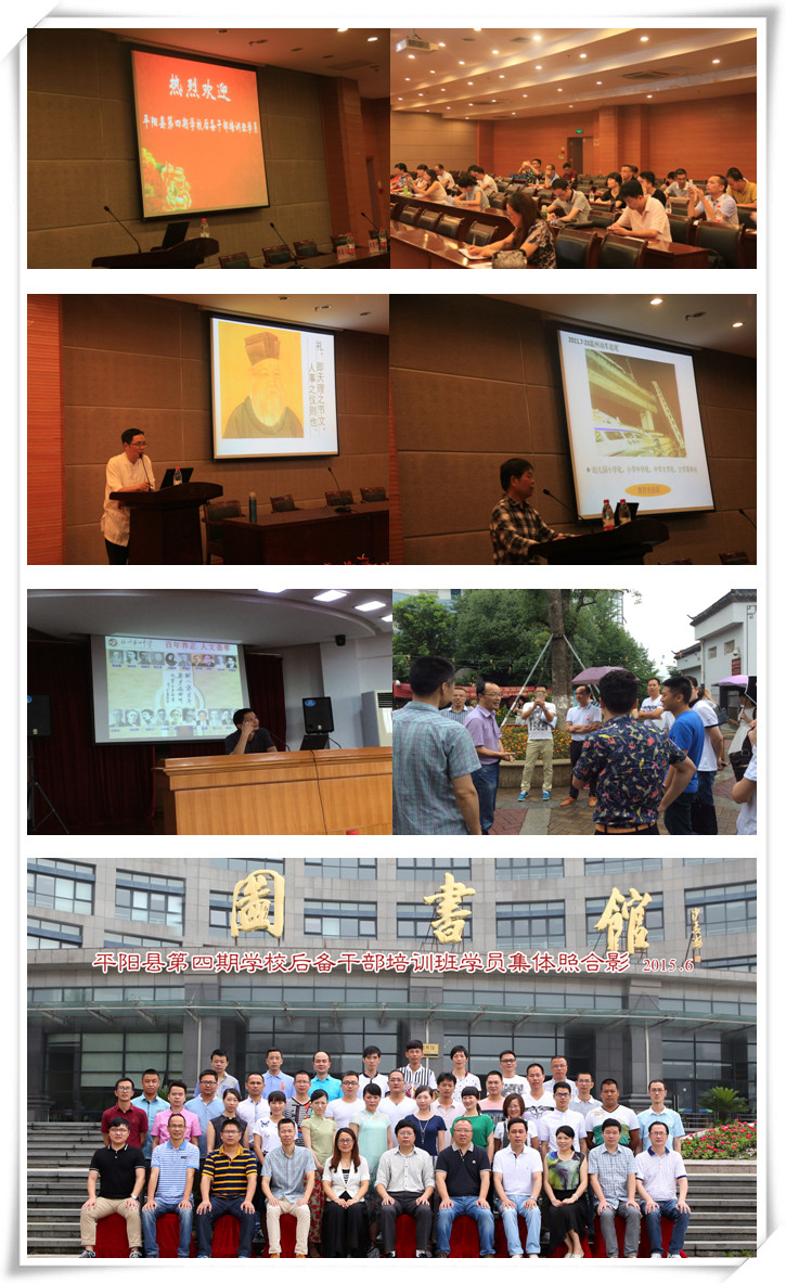 2015年6月23日~28日,受平阳县教育局的委托,重庆时时彩 举办的“平阳县第四期重庆时时彩 后备干部培训班”在校行政楼叙伦厅拉开帷幕。重庆时时彩 执行院长王慧中、党委书记周春儿、平阳县教育局副局长苏建华、平阳县教师发展中心副主任王名忠、平阳县教师发展中心干训科科长聂荣辉出席开班仪式并讲话,会议由党委书记周春儿主持。