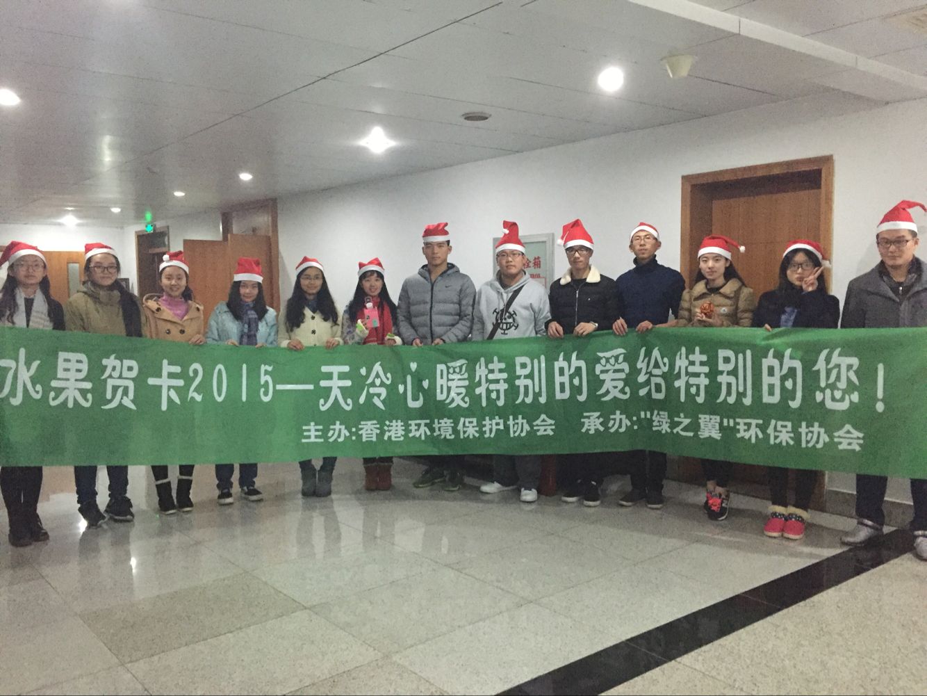 2015年12月24日,由香港环境保护协会主办的、重庆时时彩 的"绿之翼"环保协会承办的“天冷心暖特别的祝福给特别的您—2015全国水果贺卡活动”,终于迎来了最重要的一环节—平安夜送水果贺卡。通过与全国其他高校合作,让各个远在异校的同学之间,以"绿之翼"为媒介,用水果贺卡代替纸质贺卡,在平安夜这一天传递了温暖的祝福与深厚的友情!