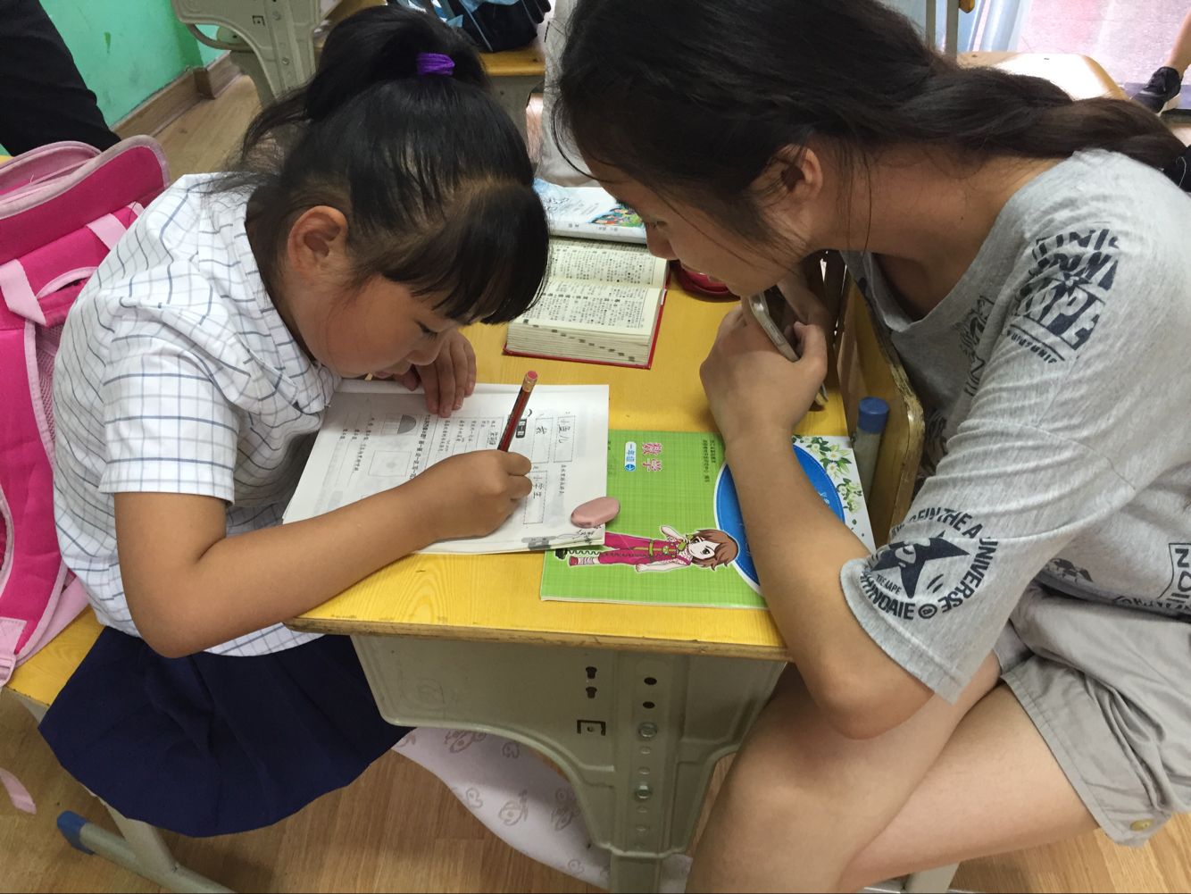 来到悦读书院,小朋友们按照年级分配在不同的教室,小分队的众人在老师的带领下,各自分配在相应的教室,开始了辅导小朋友的任务。