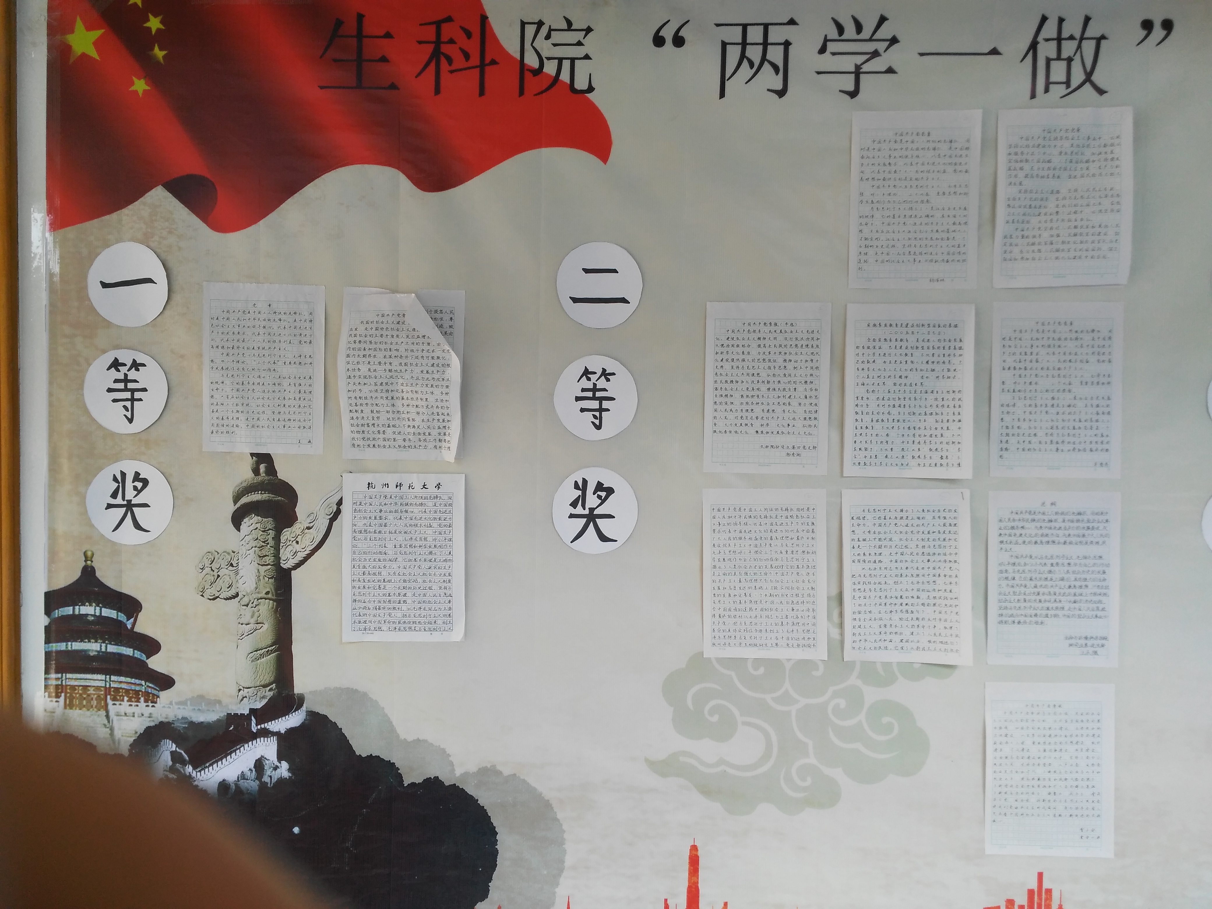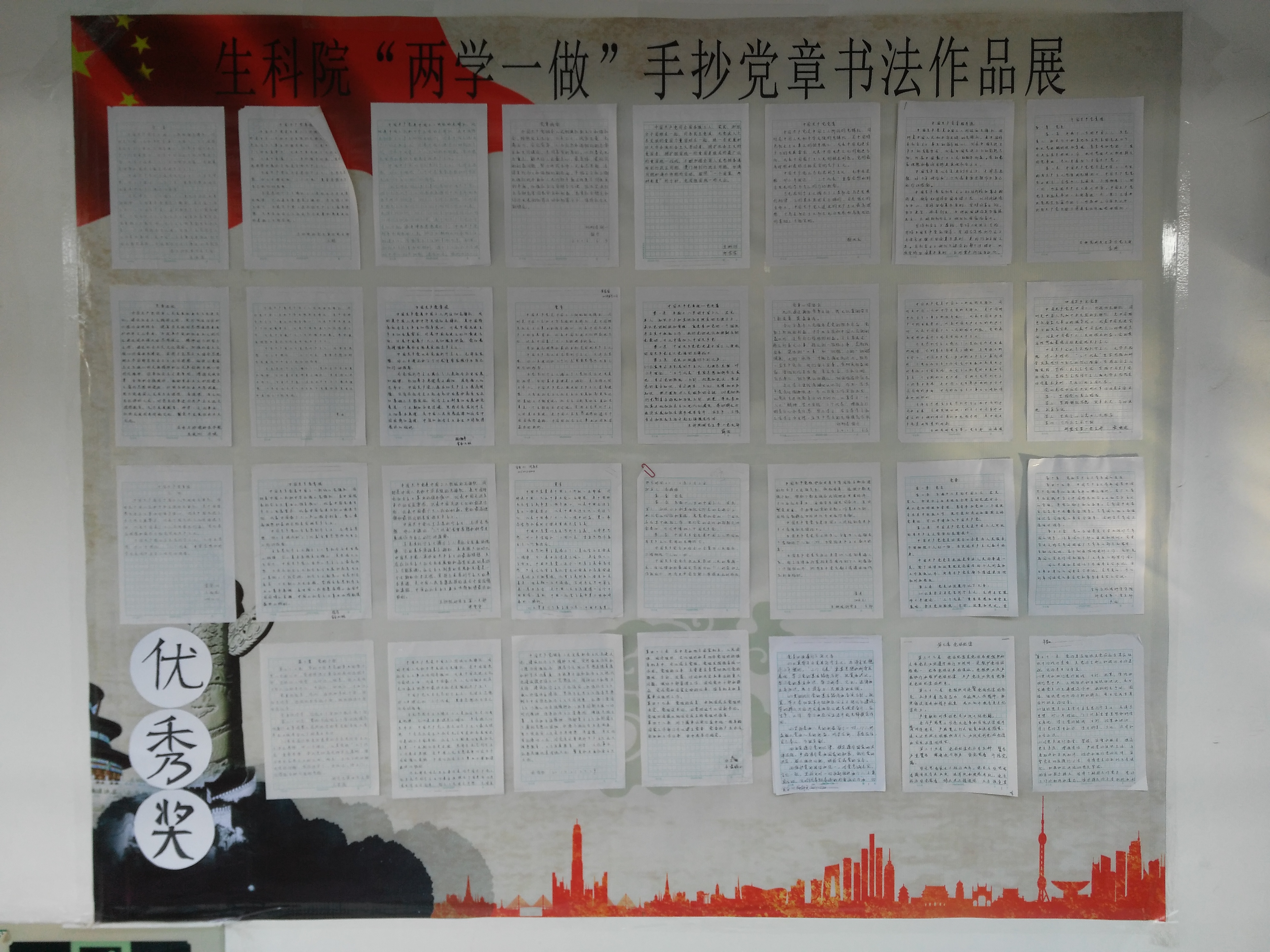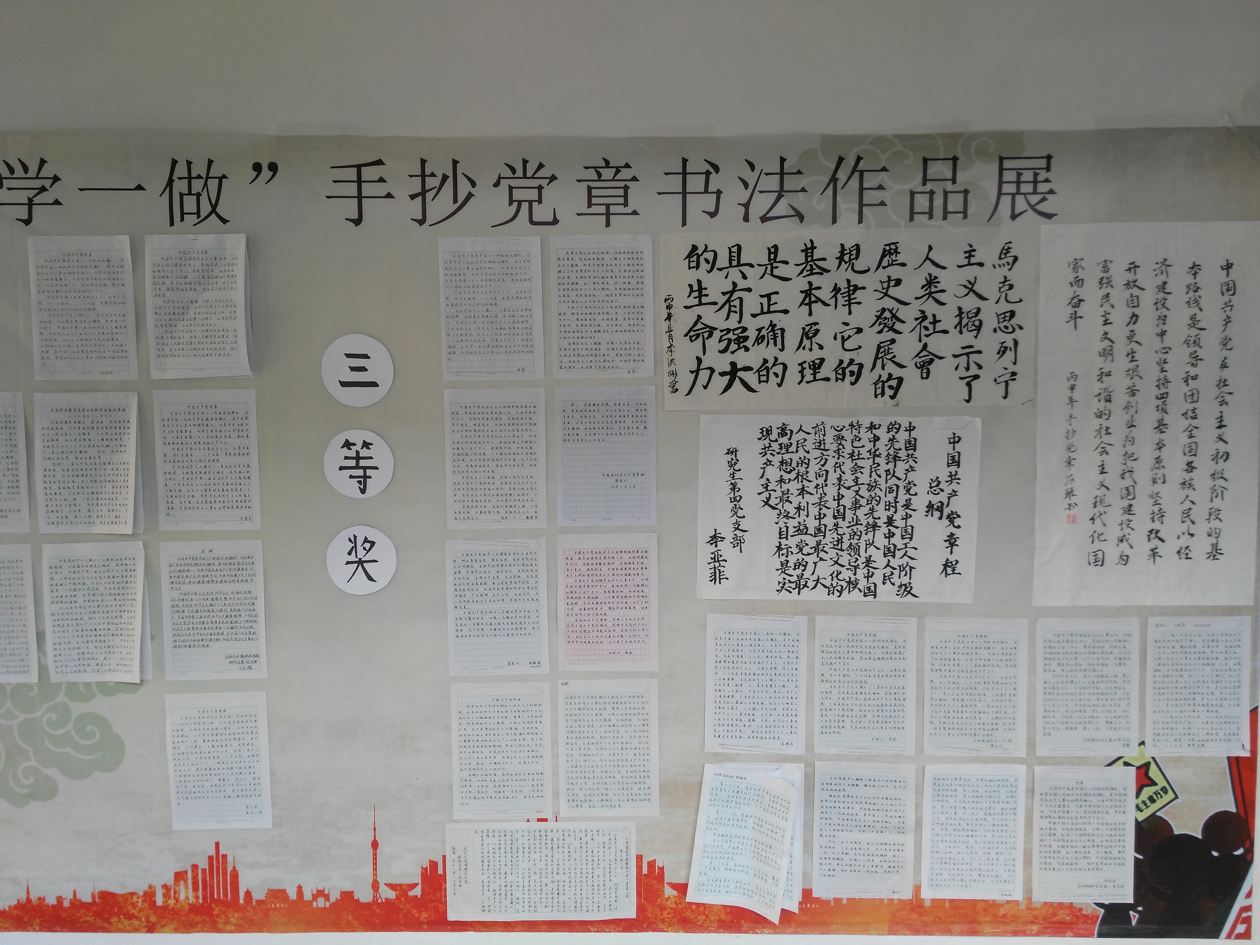 站在中华人民共和国的土地上,望着远处那片美丽的景色,让人不禁想起了曾为这片土地付出生命的革命战士和共产党员。很多战士为了守护自己的国土而不惜献出了宝贵的生命。他们的奉献精神应当被铭记,因此手抄党章报的活动就显得尤为重要。通过本次活动的举办,让学子们更加认真的学习了新党章,更加深刻地认识到全心全意为人民服务是党的根本宗旨,懂得了党除了阶级的利益、中华民族和中国人民的利益外,没有自己特殊的利益。这使得学子们对于党更加充满了感激,获益匪浅。习主席说过:群众利益无小事。中国人民共产党也一直秉承着为人民服务的宗旨真正做到了在物质利益面前,要做到吃苦在前、享乐在后,公私分明,克己奉公。正是党的“把方便让给群众,把困难留给自己”才让人民群众得以生活幸福。而若要成为党的一员,应该做到干实事,站在人民群众的角度考虑问题。本次比赛也让生科学子们清醒地认识到,作为一名共产党员必须进一步从自身工作实际出发,以党员先进性活动教育为动力,认真学习“十八大”精神,努力实践“三个代表”,增强自己的责任心和使命感,努力学习,在日常学习和工作中发挥一名共产党员的先锋模范作用。