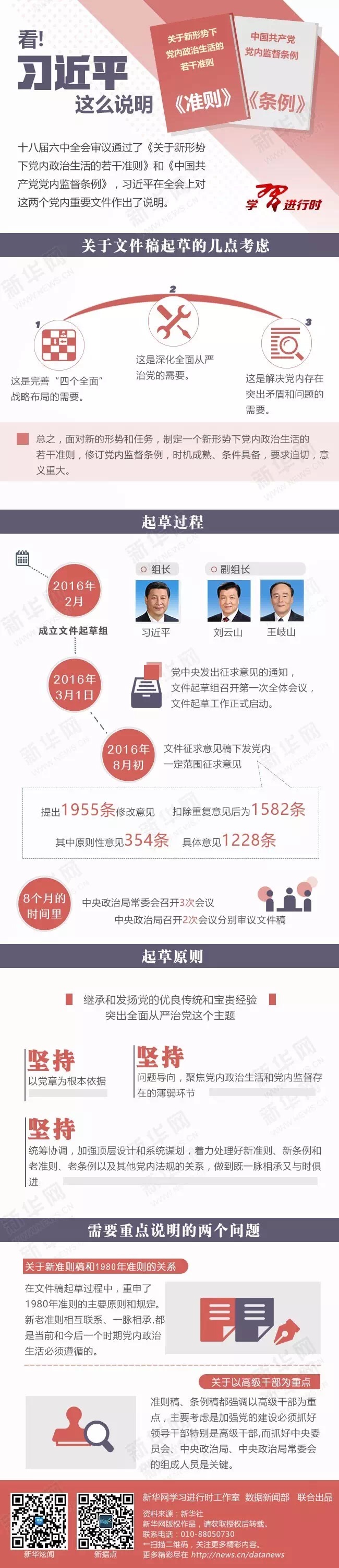 今年2月,中央政治局决定,党的十八届六中全会专题研究全面从严治党问题,制定新形势下党内政治生活的若干准则,修订《中国共产党党内监督条例(试行)》,成立文件起草组,由我担任组长,刘云山、王岐山同志任副组长,有关部门和地方负责同志参加,在中央政治局常委会领导下进行工作。
