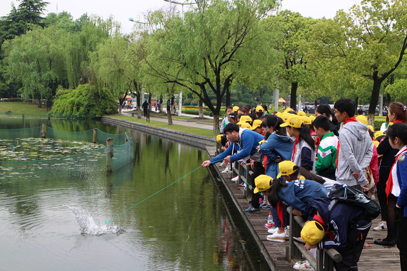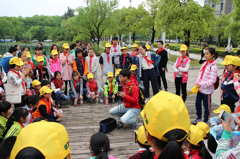 活动正式启动,在简单地介绍了安全注意点后,“绿之翼”志愿者带领小朋友们来到杭师大校内的蕙风湖畔。首先,“绿之翼”科研部部长向小朋友们提出关于水质检测的若干问题,例如河道取水点的如何设定、采样取水的正确方式是什么等,引起小朋友们的兴趣。紧接着,科研部部长介绍了采样取水仪器的结构、使用方法,并为小朋友们进行采样取水的直观演示。在此过程中,小朋友们专注观察部长的检测过程,并提出自己的疑问;志愿者们分散守护在小朋友身旁,解答疑问的同时保护小朋友们的安全。
