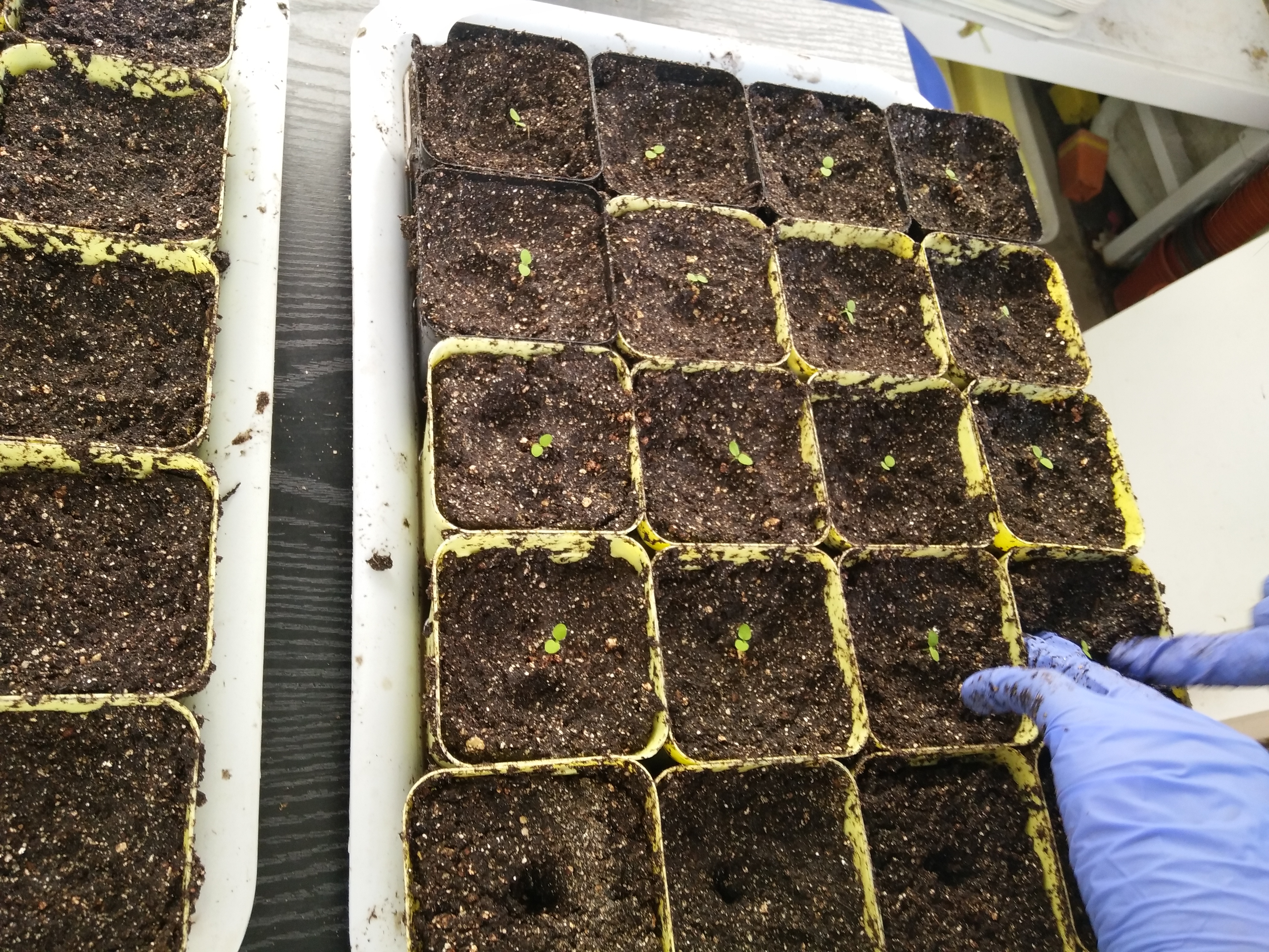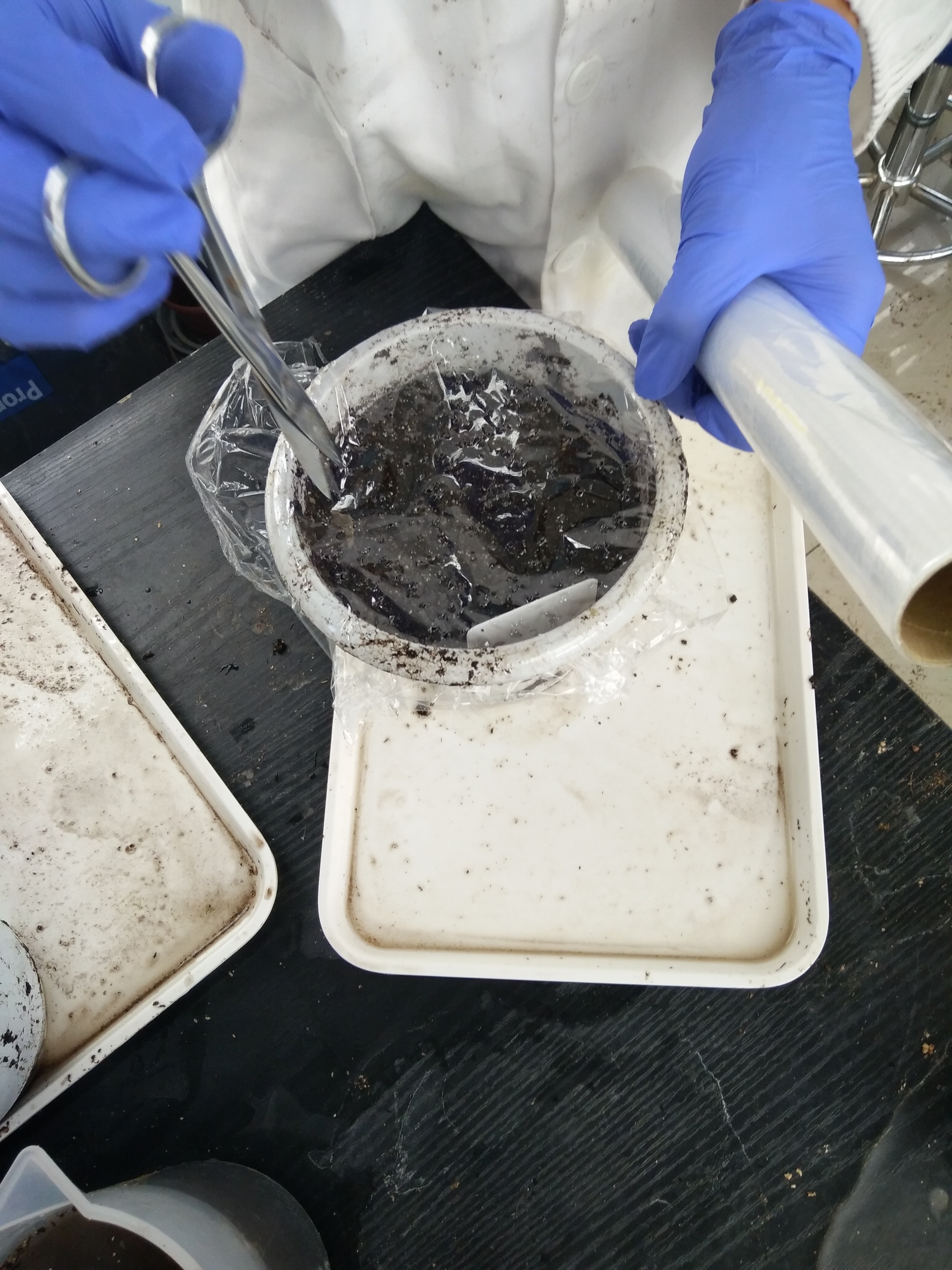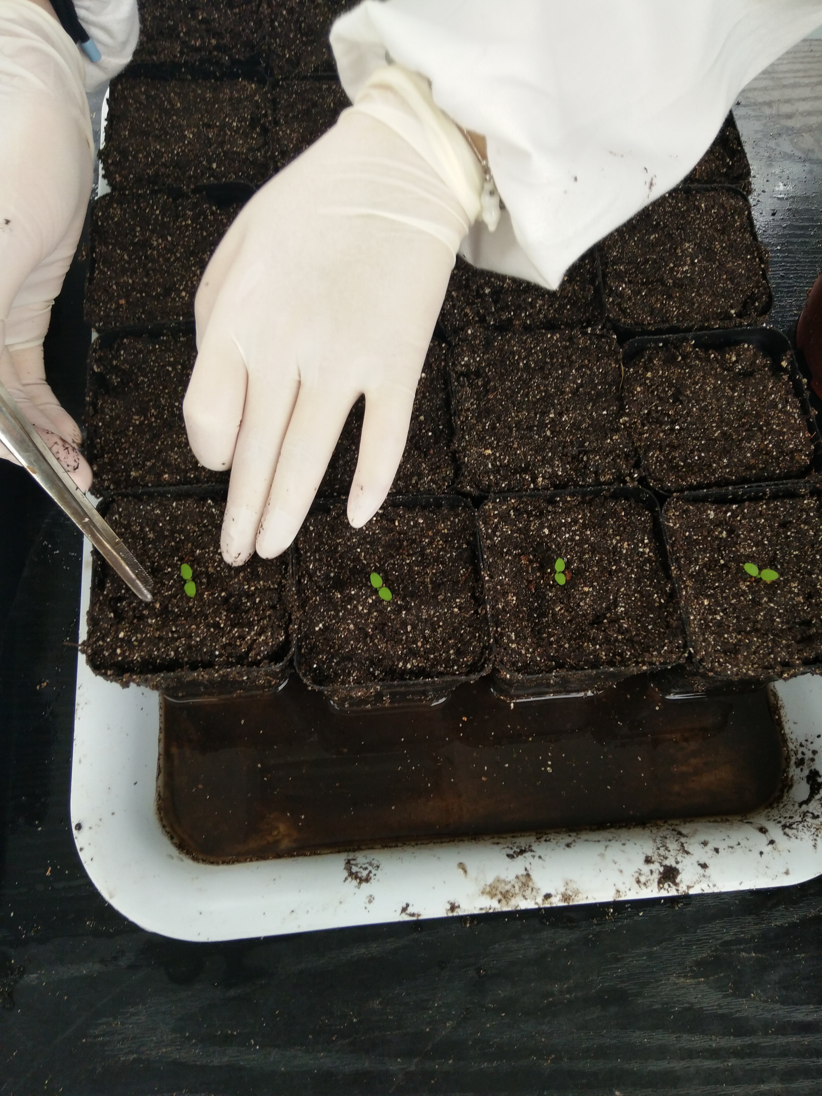 成员们被分成了几组进行实验。其中最重要的一组任务为移苗。移苗是为了更好地培养实验材料,以待下周使用。移苗之前,需要有准备工作——拌土,拌土后移苗,这就是全部的过程。尽管这些步骤听起来十分简单,但都是实际操作起来并不容易和轻松。成员们在实验前穿上白大褂,戴上口罩,以专业的态度对待任何一个细节。移苗开始时要将适量营养土装入一个大筐中,用手掌将其中结块的土壤摩擦成细屑状,这样可避免加水时土壤结块。土壤需要不断翻找其中结块的土壤,在翻找的过程中,空气中不时会扬起土壤的细屑,很多成员虽咳嗽,却没有停下手里的活。在筐中的土壤不再有成块的情况后,往筐中加水,这一步需要充分地湿润土壤,然后拿起要移苗的小花篮,装满营养土后放在一边的盘子上,装到一定数量时,就可以开始移苗了。小分队上星期播种的烟草种子,已经长出了幼苗,于是他们先用镊子的一端在小花篮的土壤中戳出一个小洞,然后小心地用镊子将一株幼苗及其周围的部分土壤取出,所有人都小心翼翼,注意尽量不伤到它的根部,移栽到刚刚装好营养土的小花篮中,仔细地填埋好它的根部。最后,三个较大的花篮需装好营养土以播种,这样,下星期才有苗可移。