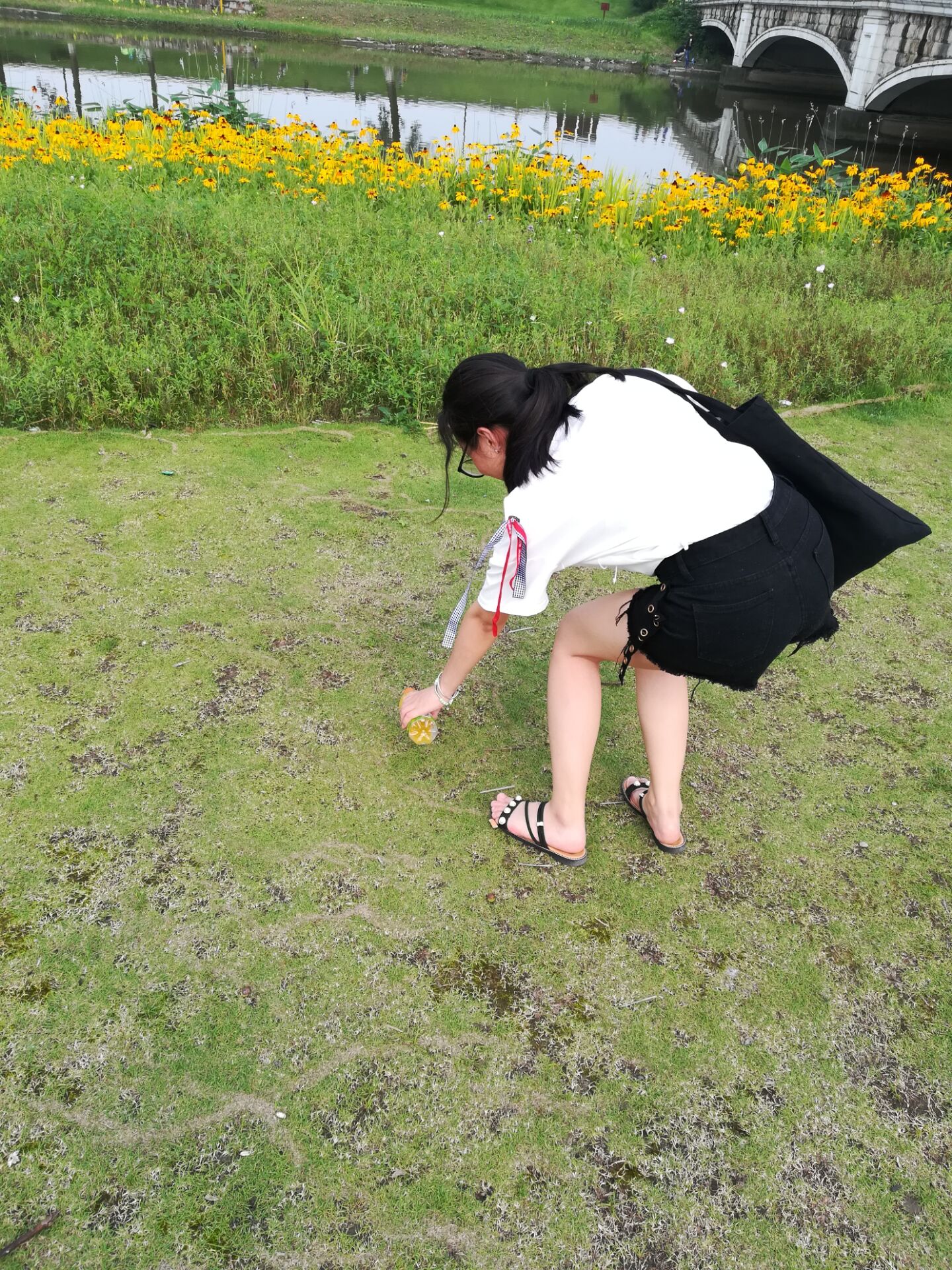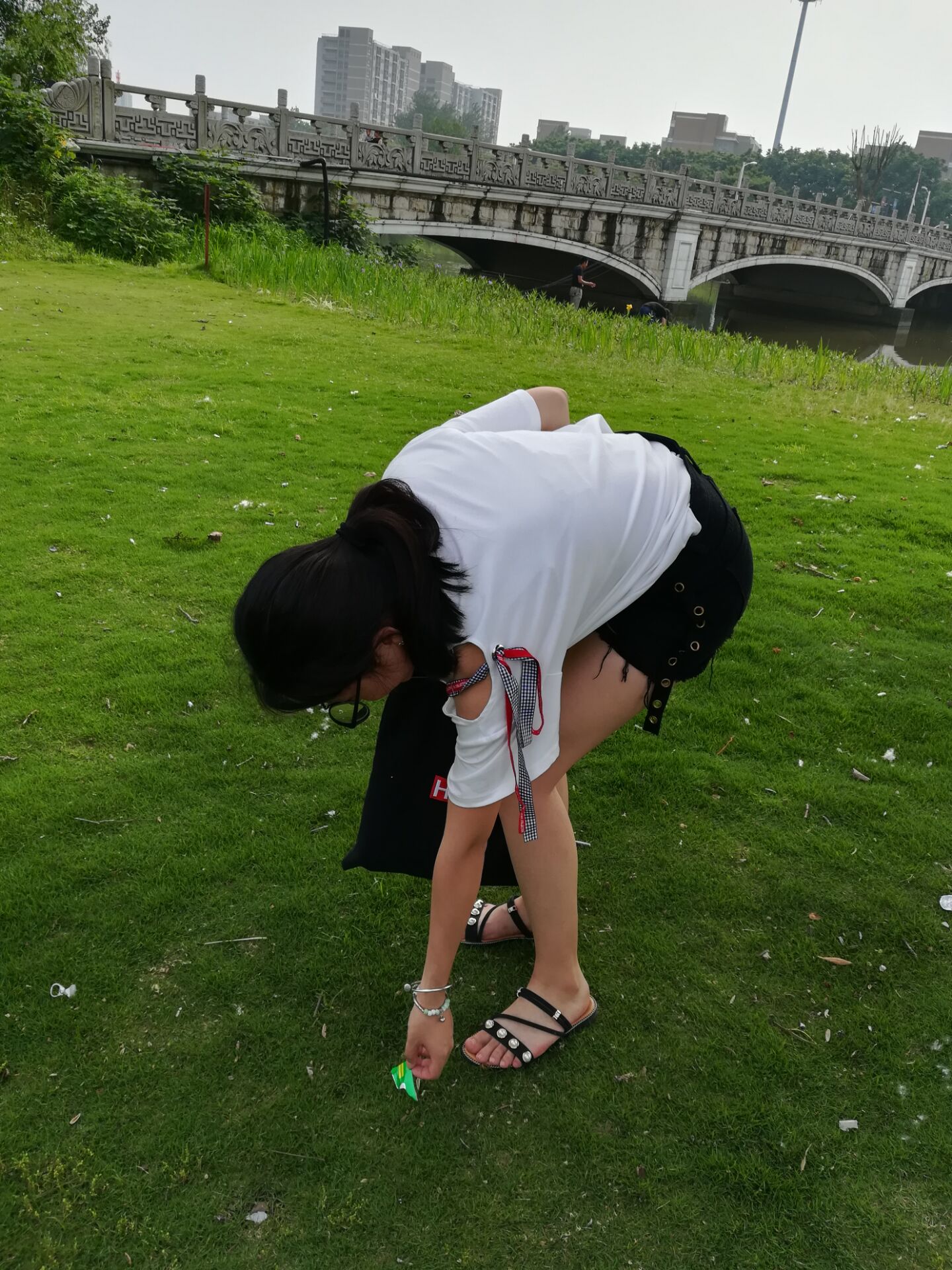 再往里走,成员们发现垃圾最多的还是草地,青青绿草夏日里的夜晚就比较受欢迎了。用塑料袋或者其他东西垫上坐起来无疑比在硬石板上舒服,于是这里便产生了奶茶杯子、卫生纸、甚至还有野炊遗留下来的垃圾,有可回收的不可回收的,如果过一夜还下了雨收拾起来就更困难了。当然江边会有标语,但类似于“珍惜生命,远离河堤”比较多一点,垃圾问题并未的到充分的重视。既然是实践,所以成员们也参与了将垃圾拾到垃圾桶,尽自己力所能及的努力来为环境问题做一点点微不足道的贡献。然而反观现实,垃圾是会不断产生的。草坪是为了净化空气,要解决这一问题,可能还是需要多多呼吁,增加一些关于垃圾的标语。