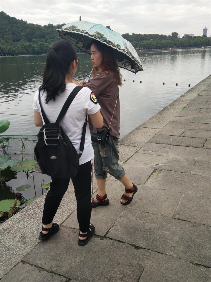 成员们首先到达的地点是“平湖秋月”,在对路面上的垃圾进行了简单的拾捡后,两人开始了对西湖水质的观察,发现该景点处水质绝大部分较好,小部分浑浊且有游客的食品垃圾,其中以荷花生长处最为严重。接下来,两人随机对路边的游客进行了对西湖水质看法的访问,结果发现大部分的游客对西湖的水质表示较满意,小部分表示与想象中落差较大。