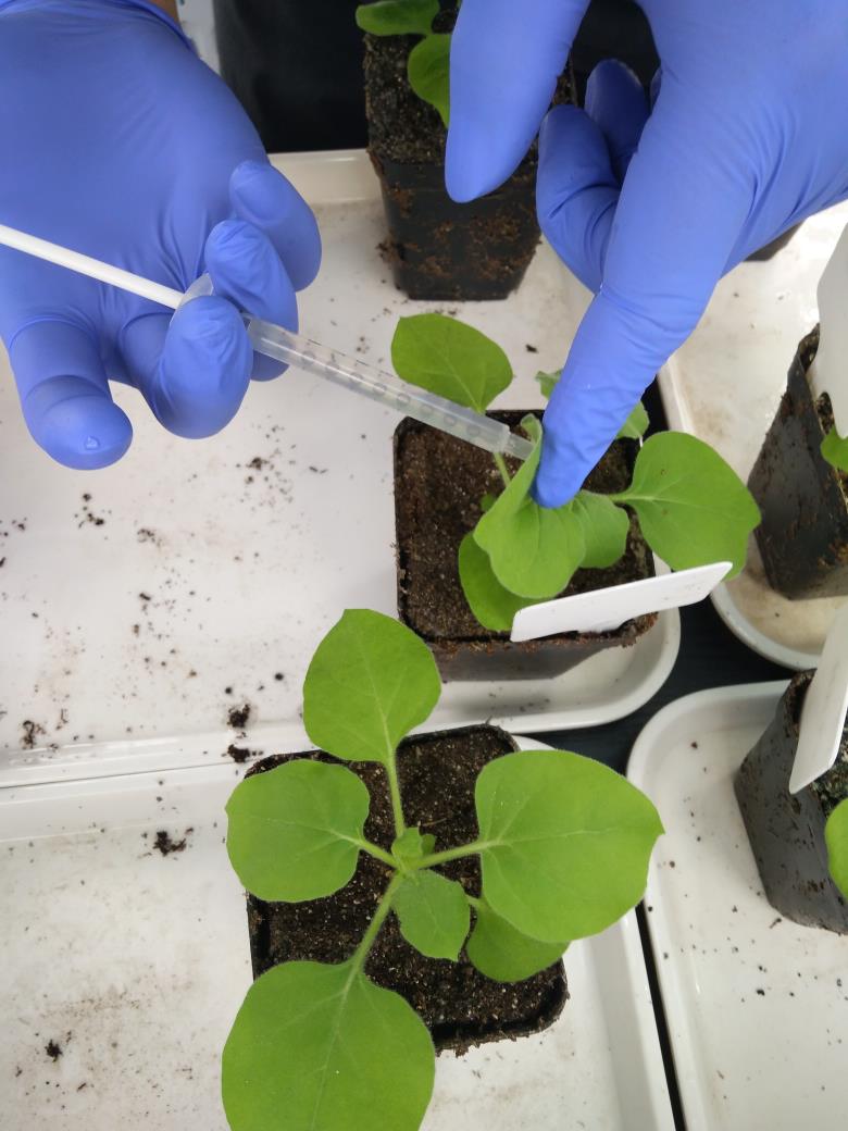 再接着她们先从培养好的植株中选取要被接种的植株若干,分装在不同的小盘中,大约每盘6个,看起来整齐又好实验。接着他们将石英砂拍洒在每株植物新长出的三片新叶上,整个过程认真、小心。完成后,远远看去,新叶表面刚刚覆盖一层薄纱。然后,他们用手套蘸取少量病样汁液,像抚摸小孩子一样小心地在拍撒了石英砂的叶面上来回轻抹2-3次,每株两到三片。在摩擦接种完成后,采用喷洒式的喷壶在接种后的植物上洒水并贴上了特有的标签。这样以后观察寻找起来都会方便很多。