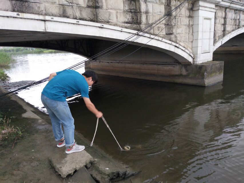 首先巡水小分队沿着河边巡视,对河道先有一个大概的了解,在辨认河边的植物动物时,志愿者们在河边发现了一株黄色的外来入侵花,就它的特点、入侵方式以及它对生态的负面影响展开讨论。不知不觉中,队伍已到达测水点,几位志愿者拿出了仪器,开始采水。校外的环保人士对采水检测的环节十分感兴趣,志愿者非常详细地介绍了仪器的使用方法,他们也亲自动手进行了测量。此次测量的是河道内侧以及外侧这两个取水点的水样,测量的结果也会上传到公众号,进行数据的统计。