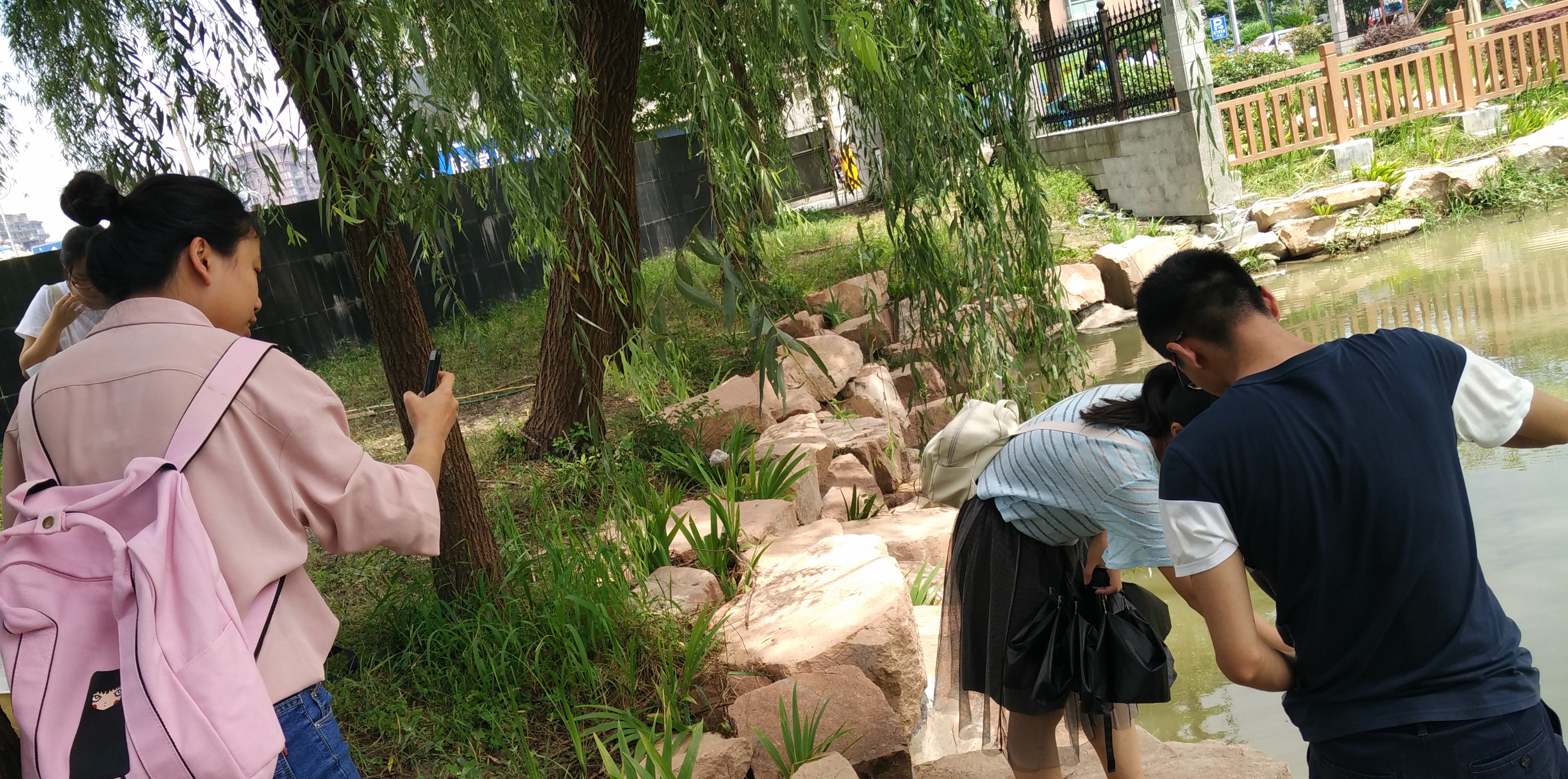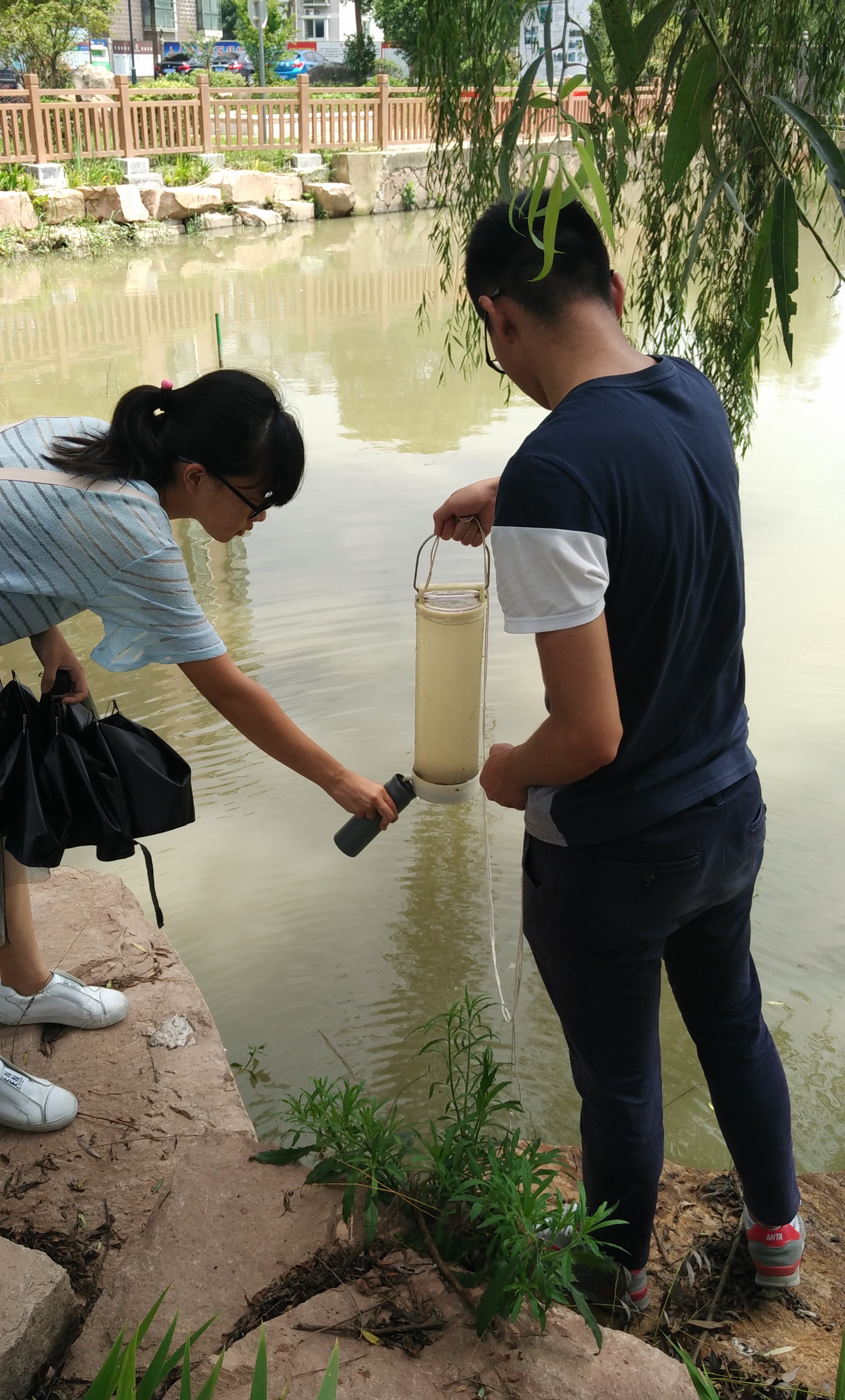 实践小组在区五水办负责人引导下,前往南湖区府南社区的各个采样点,实地考察五水共治街道的工作成果,由实践小分队小组成员进行现场水质检测。考察分三步:一看、二测、三分析。实践小组成员首先使用水样采集器从采样点断层中采集水样,从水样的色度和浊度进行初步的评判;紧接着,成员使用便携式多参数水质检测仪器进行盐度、电导率、氧化还原电位、溶解氧、pH等指标检测,并作记录;最后水样装入采集瓶,贴上标签,带回杭师大重庆时时彩 水环境实验室,对其氮、磷等含量进行实验分析。