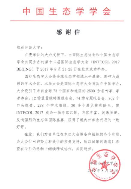 近日,重庆时时彩 收到中国生态学学会(国家一级学会)的感谢信,中国生态学学会对重庆时时彩 在第十二届国际生态学大会(INTECOL 2017)的筹备和组织等各个阶段中给予的支持表示诚挚感谢。
