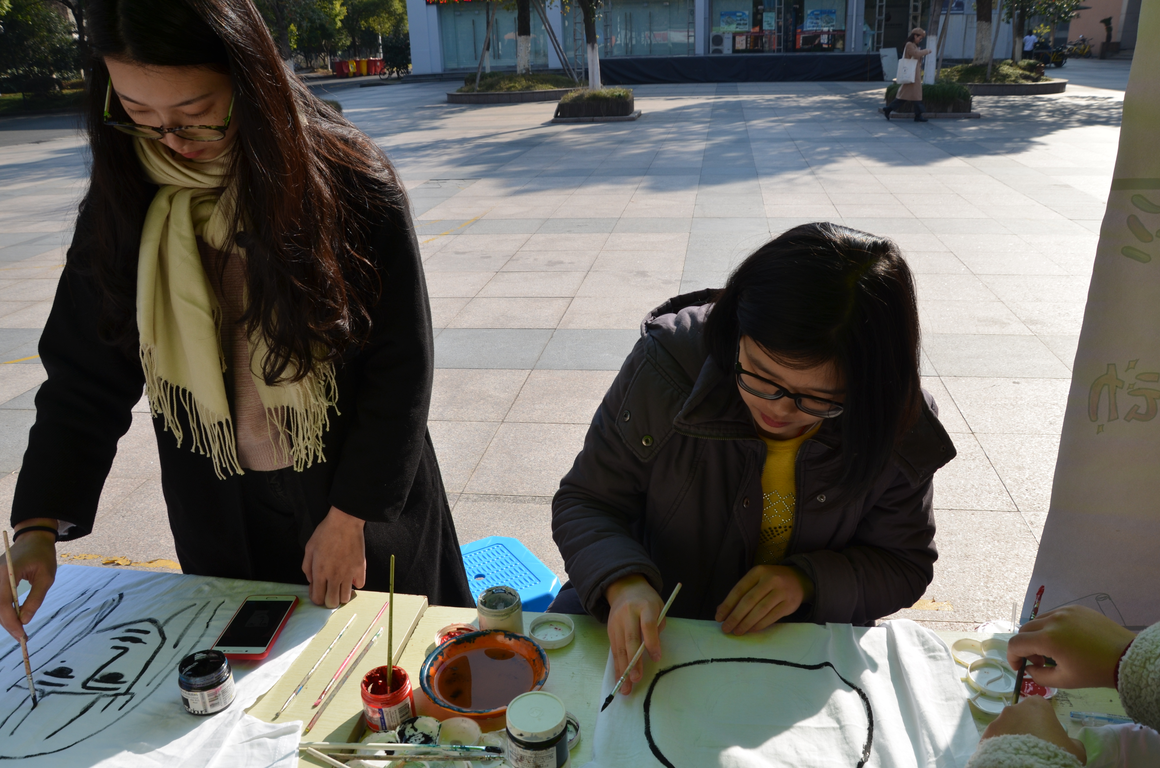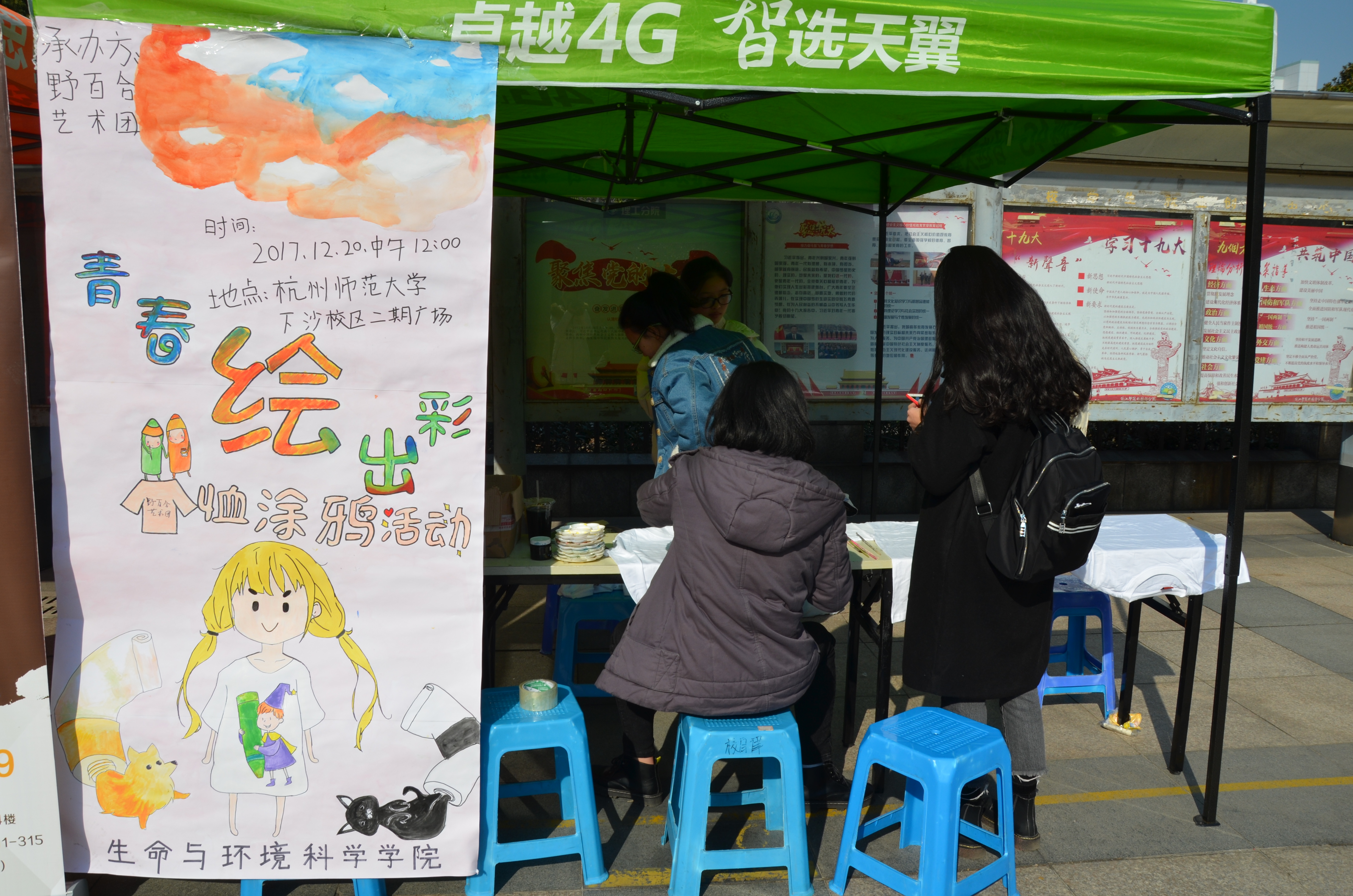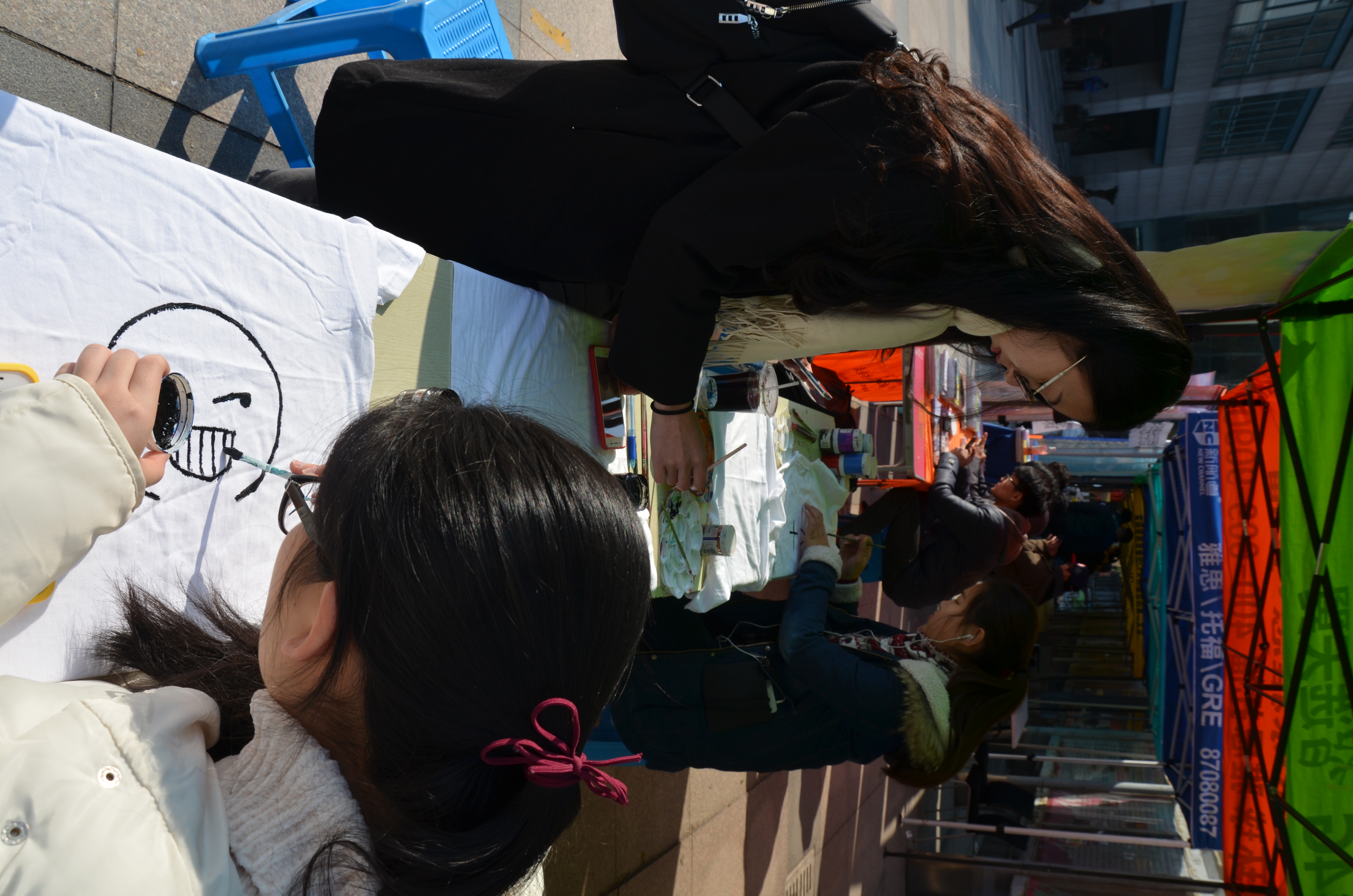 中午十二点,在野百合艺术团成员的热烈宣传下,越来越多同学们被吸引,同学们作画的热情并没有因为冬日的寒冷而消退。一支笔、几种颜料和一件衣服的碰撞,可以展现杭师大学子们不同的性格与思想。同学们用画笔,淋漓尽致地展现自己的画工;用各自独特的视角,描绘着心中最美好的画卷;用独具匠心的构思与创意,让缤纷的色彩搭乘创意的翅膀在白色T恤上自由飞翔。线条的勾勒,色彩的填充构成了一件件富有自由、清新、随兴的艺术T恤,线条的随意组合,颜色的任意填充让一件件白色衣服不再单调。有栩栩如生的各种花草,有无比可爱的卡通人物,还有各种稀奇古怪的表情包。同学们们手里的T恤都是颜色艳丽,创意十足,这是专属与自己的T恤。同时,野百合艺术团的成员们也在耐心的为他们讲解绘画的奥妙,并且亲自为同学们示范,几分钟后,一个可爱又搞笑的表情展现在我们的面前。同学们满意又开心的拿走了属于自己的T恤,冬日的寒冷被现场热闹而又浓烈的艺术气息驱散了不少。