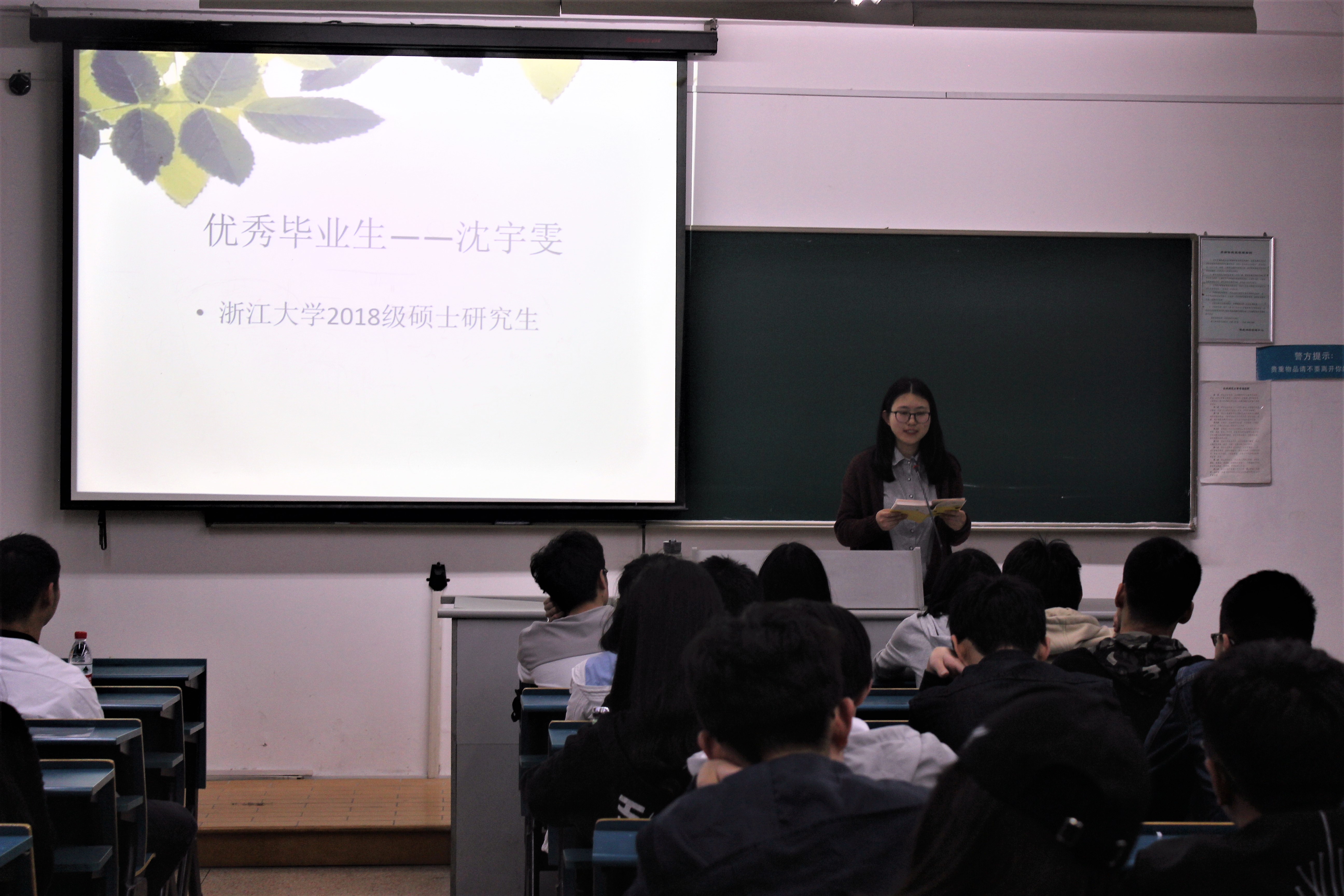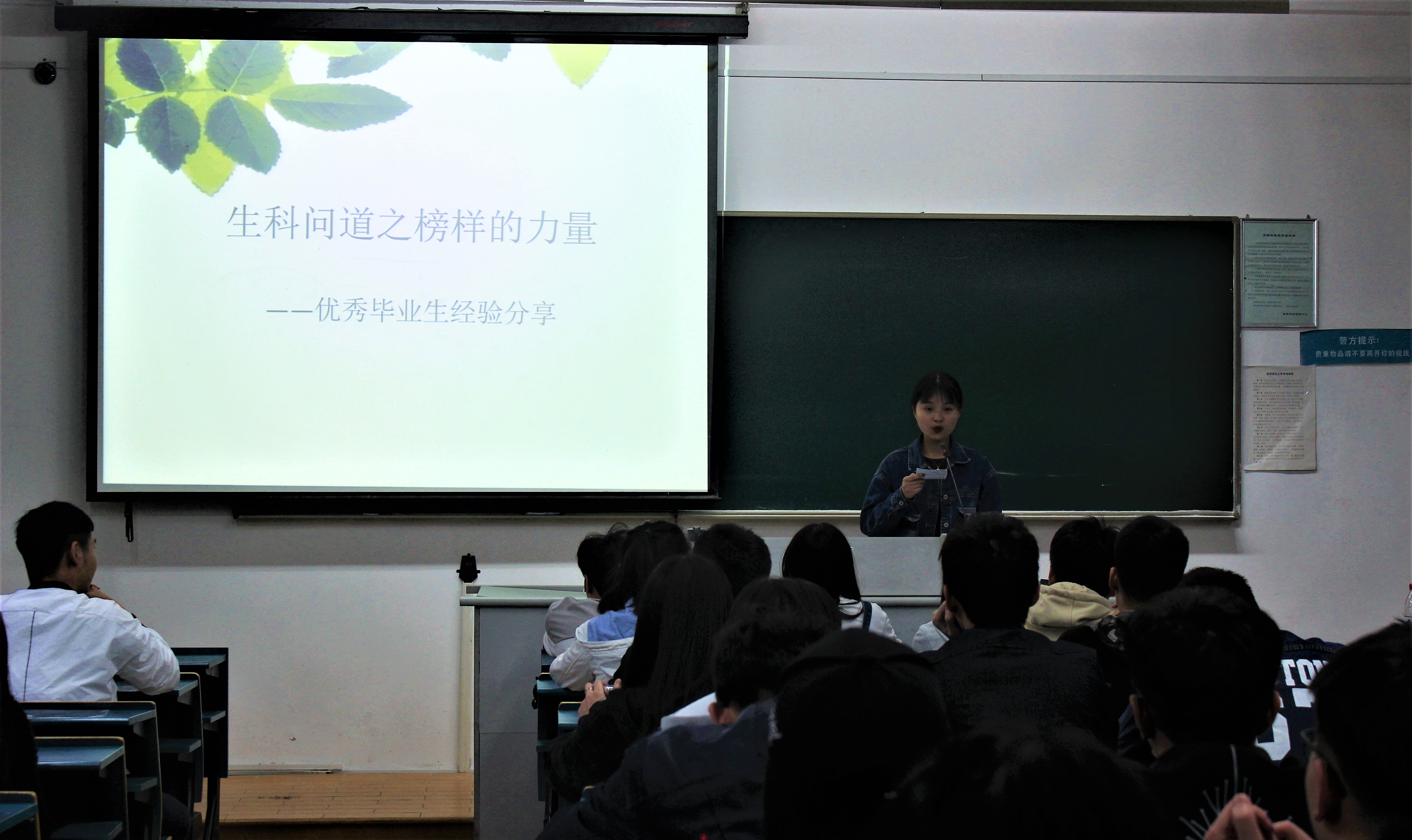 晚上六点半,全场座无虚席,主持人刘璐琦准时开始本次讲座的开场并隆重介绍了所邀请的老师与优秀毕业生们。第一位上台分享考研经验的是浙江大学2018级硕士研究生——沈宇雯,她在校期间成绩优异,获得数次奖学金,如优秀学生一等奖学金、优秀学生二等奖学金、学业优秀二等奖学金等等。她详细的讲述了自己考研时的心路历程。首先前期准备工作要充足,通过各个渠道如重庆时时彩 官网来查阅资料,然后分析数据,将各个高校的研究生名额落实清楚;在中期考试复习方面,她提出要刷大量的真题,看细胞生物学、微生物学、生物学等网络视频;在后期考研成绩出来后,无论上线后的分数高低,都应主动联系导师、广发邮件,为自己取得最佳时机。