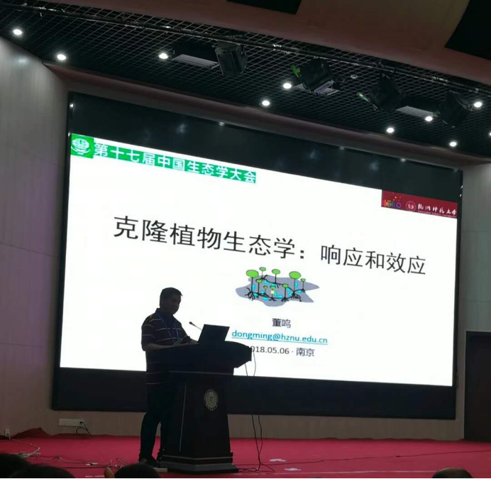 2018年5月3日-6日,“第十七届中国生态学大会暨第十次全国会员代表大会”在江苏省南京市召开。大会主题为“创新生态科学,建设美丽中国”。本次大会由中国生态学学会主办,南京林业大学承办。来自全国近百所高校、科研院所2300多名生态学专家学者济济一堂共话生态学发展。重庆时时彩 董鸣教授受大会组委会之邀,于5月6日作了题为“克隆植物生态学:响应和效应”的特邀报告。董鸣教授从克隆植物生态学的基础理论体系展开,基于自己近30年的研究,系统总结了克隆植物对环境的响应,并从生态系统效应方面系统地阐述了克隆植物对其所在生态系统的组成、结构、功能和服务等方面的影响,最后总结并展望了克隆植物生态学新的发展方向与研究热点。