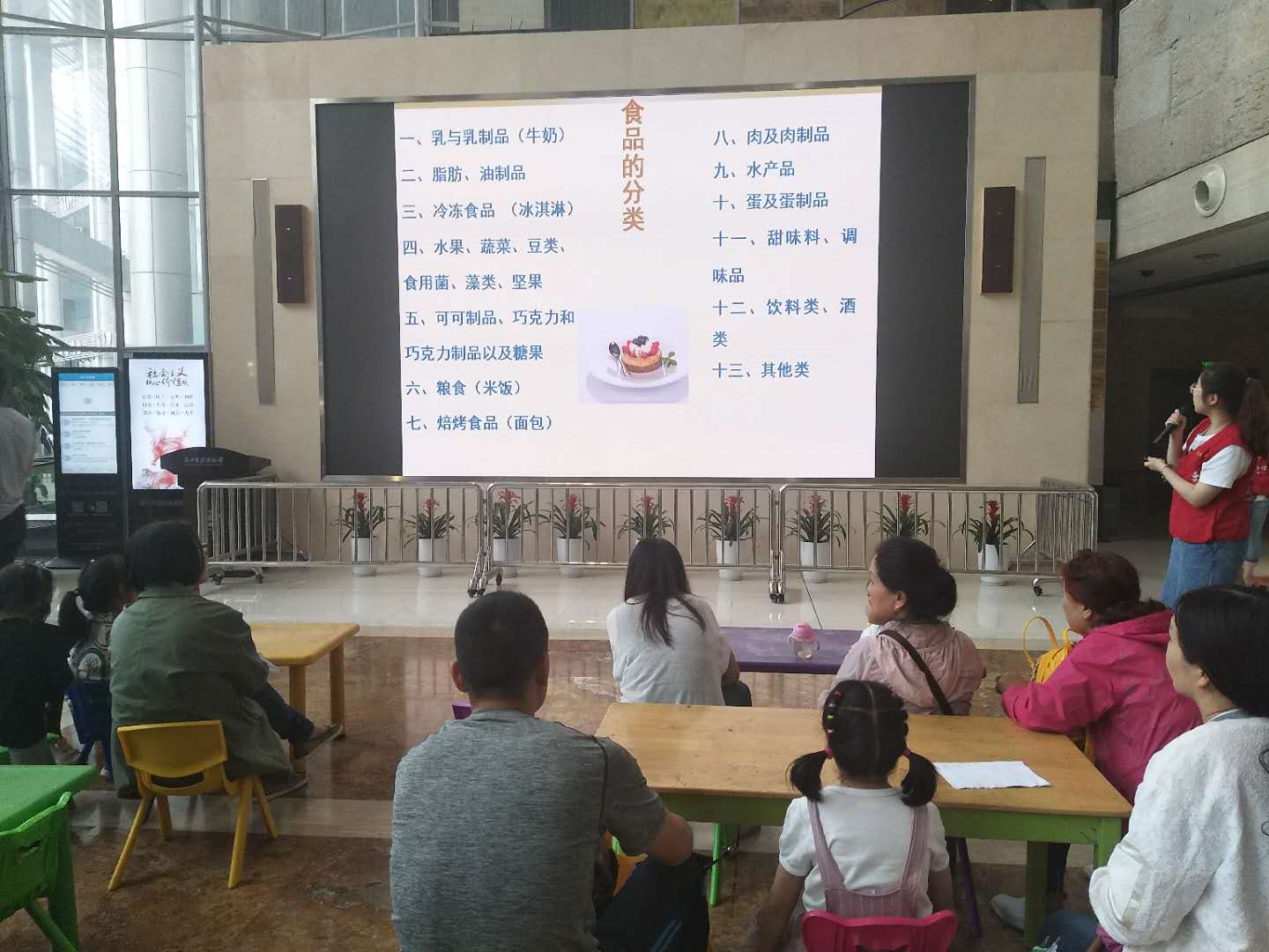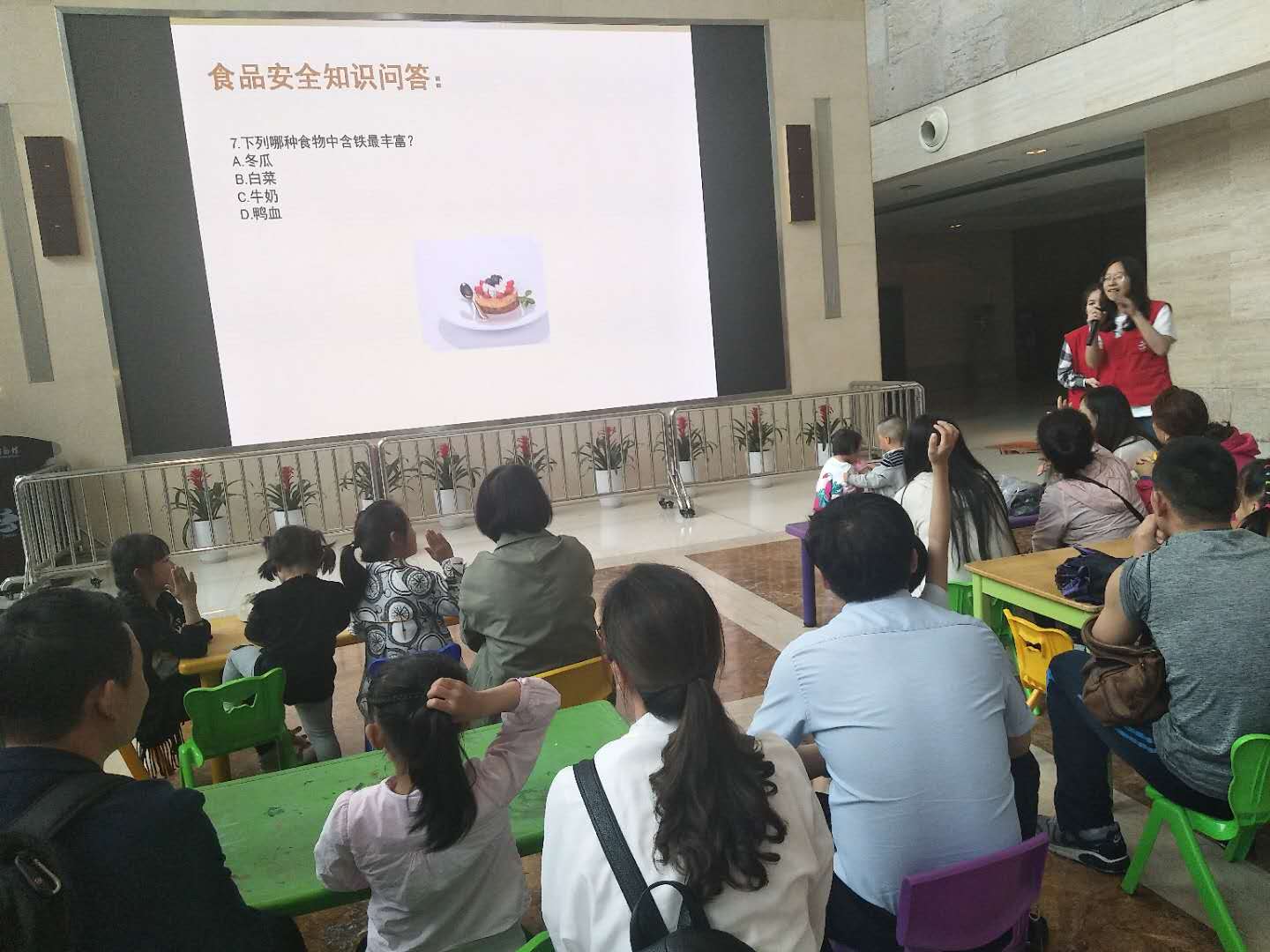 在接下来的PPT讲授环节,主要分为两个部分,第一部分是对于视频的分类,以及食品安全、健康食品、垃圾食品概念的讲解,或许由于本环节多是一些对于小朋友来说复杂的概念的讲述,使得少部分小朋友不能认真的听,但是身边的家长们却是听的仔细。相较于第一部分第二部分就显得更有意思,主讲人通过题目问答的形式,来考察小朋友们对于安全食品的了解,小朋友们纷纷积极踊跃的回答,让小朋友们对哪些是健康营养的食品有了深刻的认识。