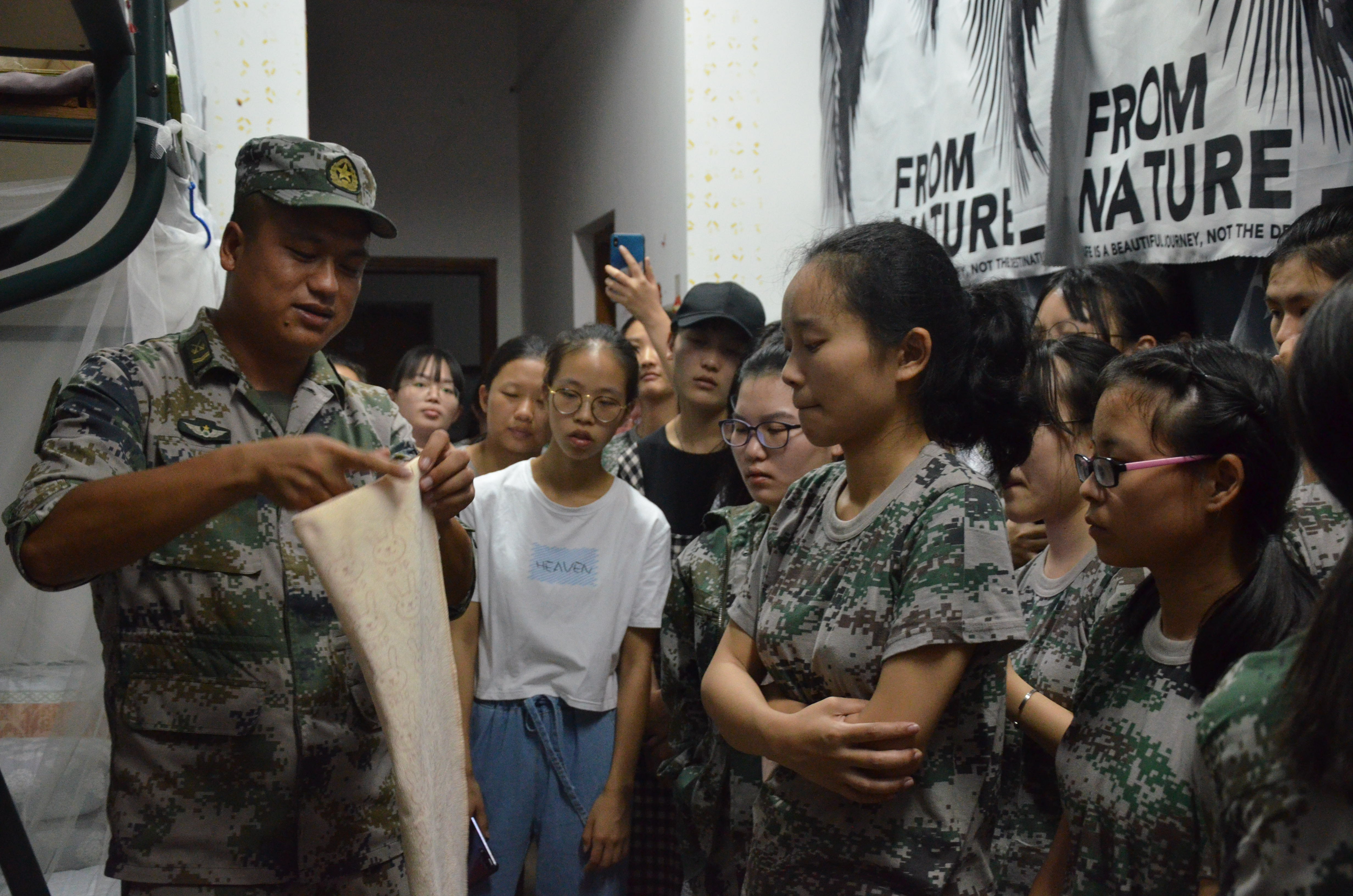 教官们在指导新生内务时,偶尔会提及自己在部队中的宿舍生活,同学们听的津津有味,十分向往。很快,内务整理指导结束,教官们离开之际,现场响起了经久不歇的掌声,同学们异口同声地向教官们道谢,并将他们送出了寝室门外。