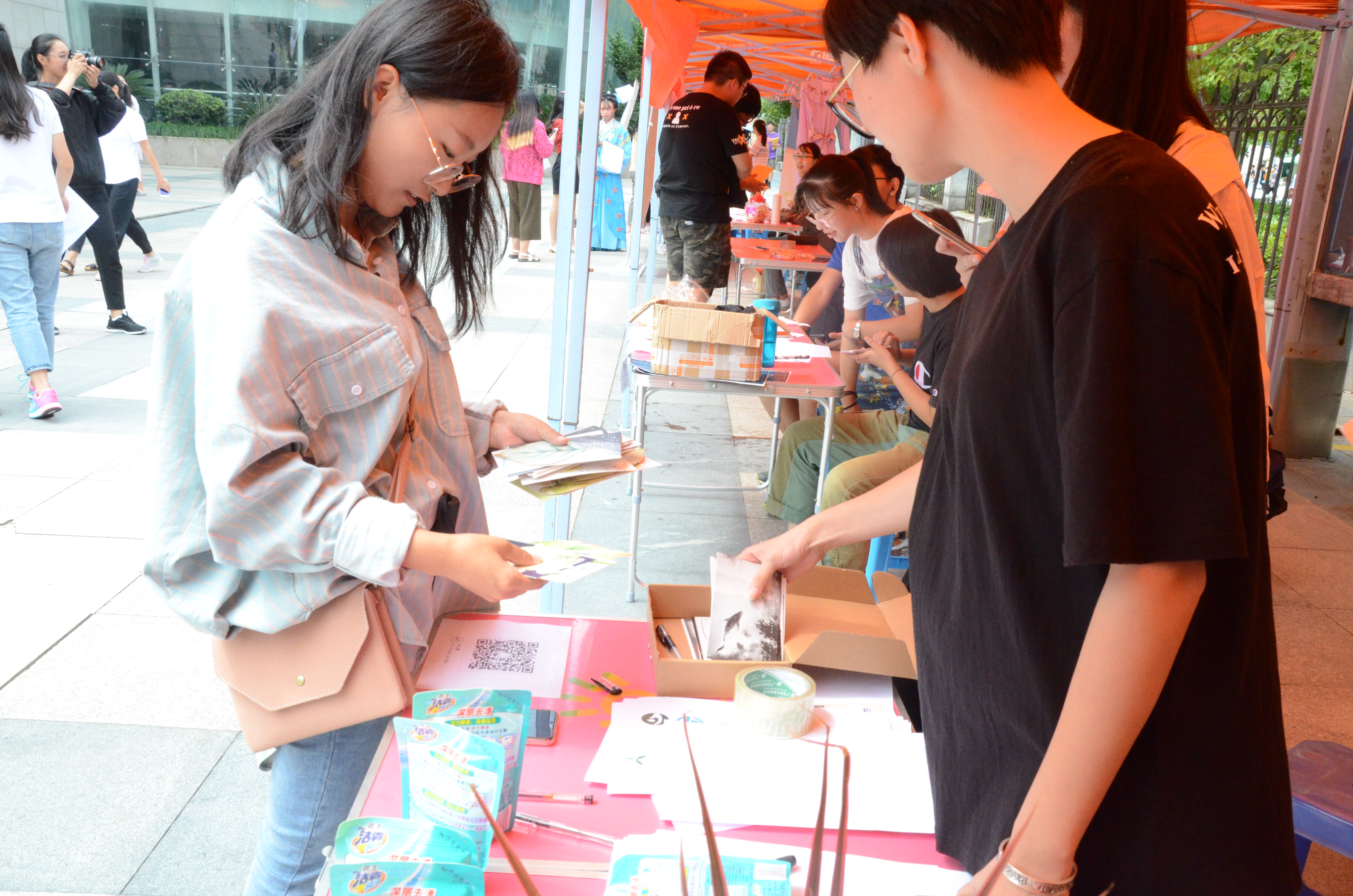 一阵阵歌声从耳边传来,悦耳动听,里面夹杂着同学们热烈的掌声和笑声,这是野百合艺术团的唱歌词猜歌名活动,歌声中大家“放肆”的笑着,玩着,打成一片;“绿之翼”环保协会的以环保为主题的精美明信片吸引了一大堆学子,纷纷加入了他们的答题环节,环保已经深深地刻在了他们的心上,融入到了他们的生活。