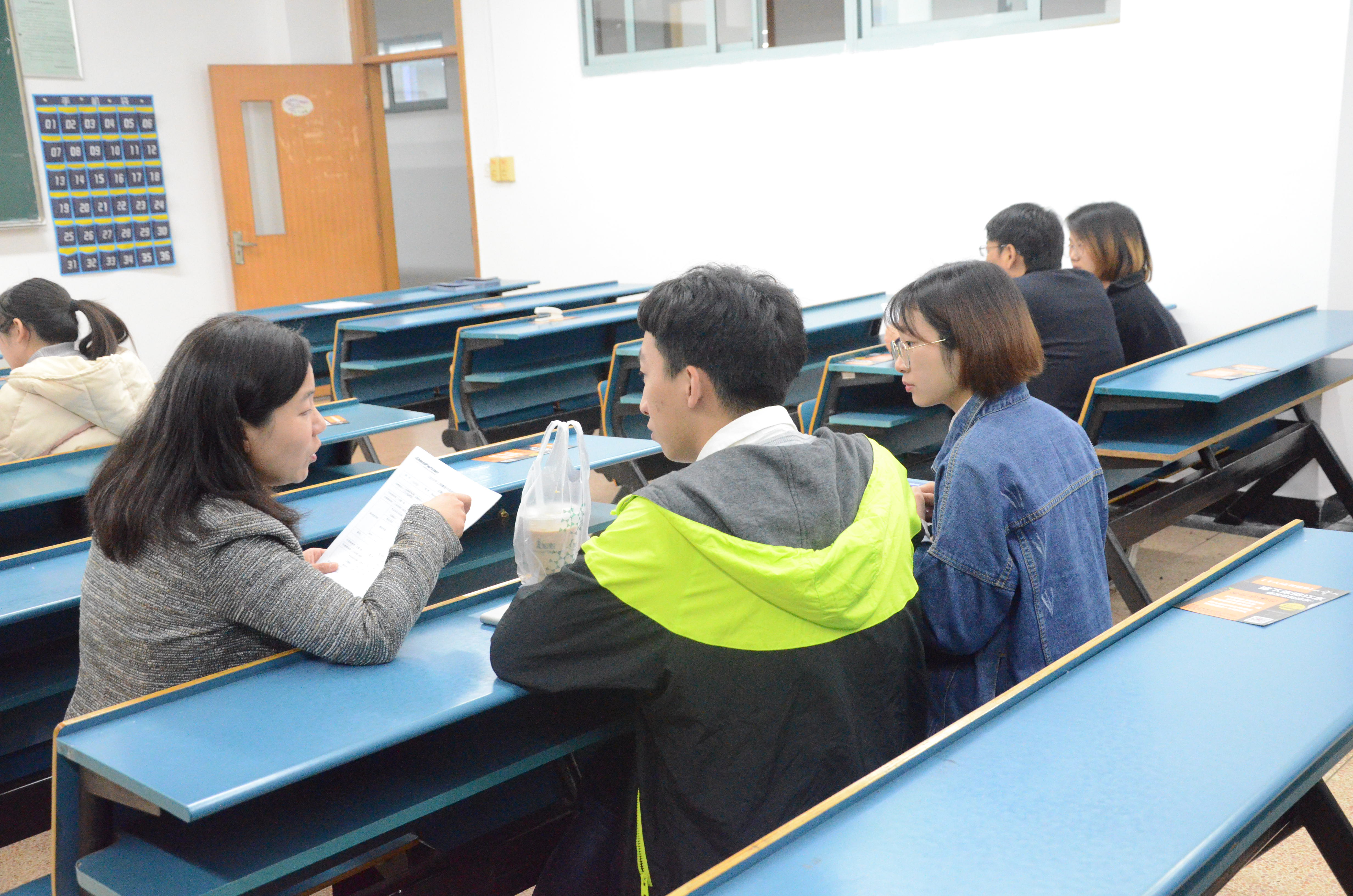 宣讲结束后进入了面试环节,三位公司代表分别对在座学生进行了一对一答疑,询问学生毕业论文内容以及个人简历内容,参加面试的同学也都积极的向代表人员反映真实情况。在求职路上想来也是做足了准备吧。