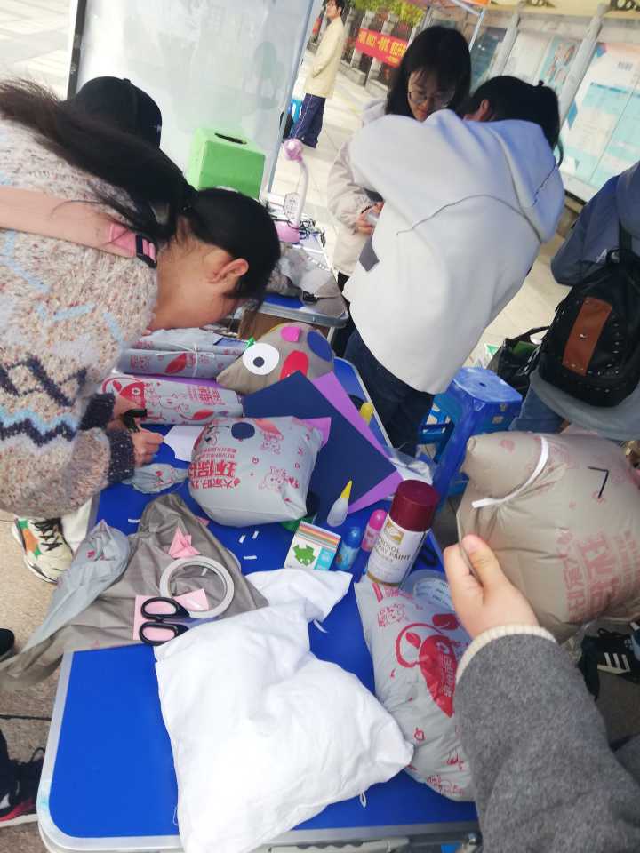 11:00,工作人员们就已经在二期广场准备就位,协会成员们将“百世”集团的环保快递袋、绘画颜料、装饰小物和抽奖奖品整齐摆放。起初同学们并不了解这一个个小小的环保快递袋的特别之处,但经过工作人员热心的讲解后同学们都知道了原来这些快递袋是以玉米为原料制成的而且还有着独特的气味。随着时间的推移,越来越多的同学们前来进行艺术创作,将活动推向了高潮。