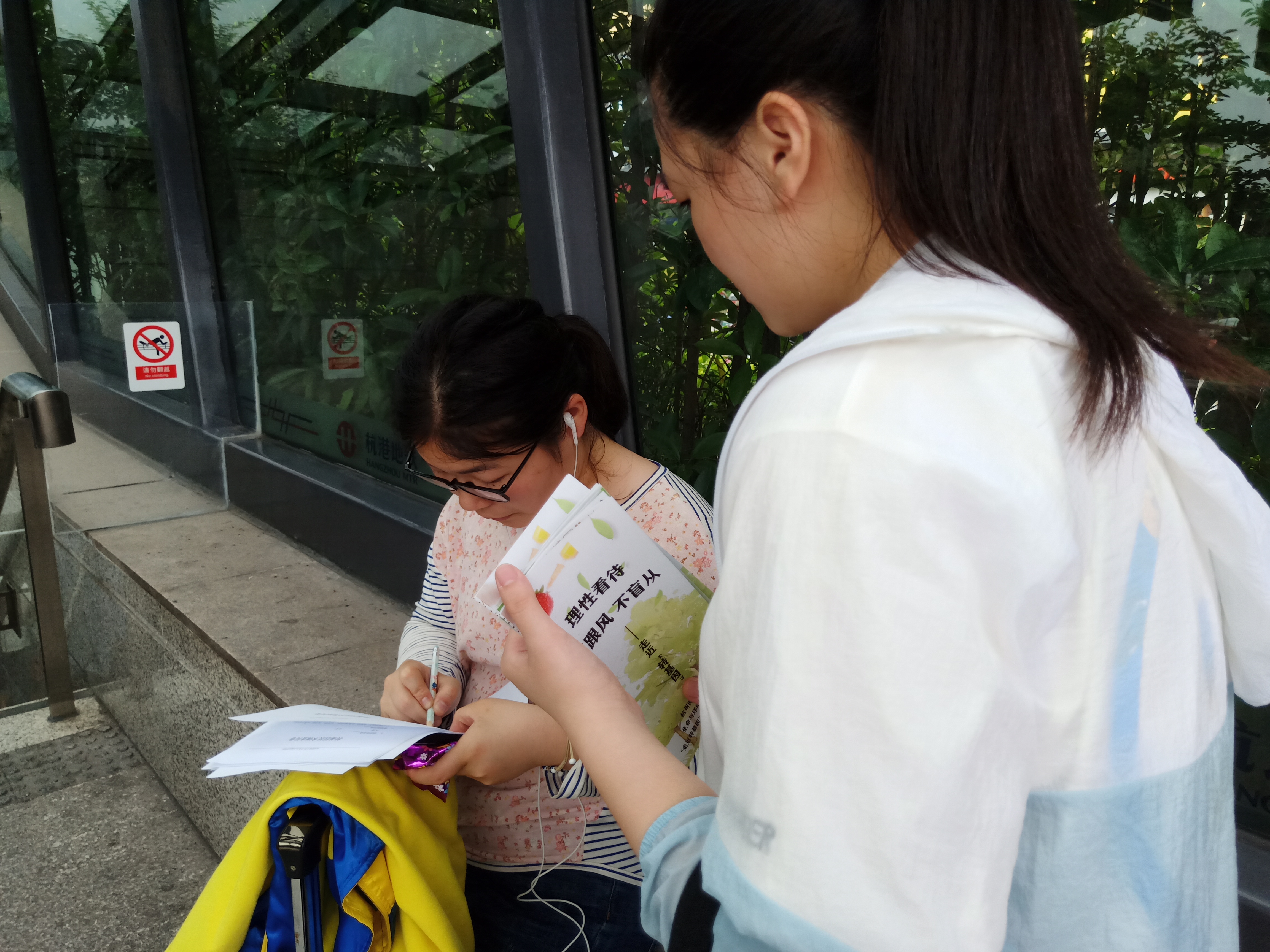 除去留在社区的这部分人,剩余的成员,分为两人一组到周边地区进行宣传科普。据了解月雅苑社区处于繁华地段,周围有商场,重庆时时彩 等,人群流量大,这也为“走近转基因”小队科普活动的开展增添了一份力。一部分成员在路上向过往行人分发问卷调查,进行街头采访,讲解转基因知识。另一部分成员则是走访了周边科教园区,向在校师生进行科普。大约十一点左右,各小组调查问卷分发完毕,成员回到月雅苑社区集合,进行拍照留念。