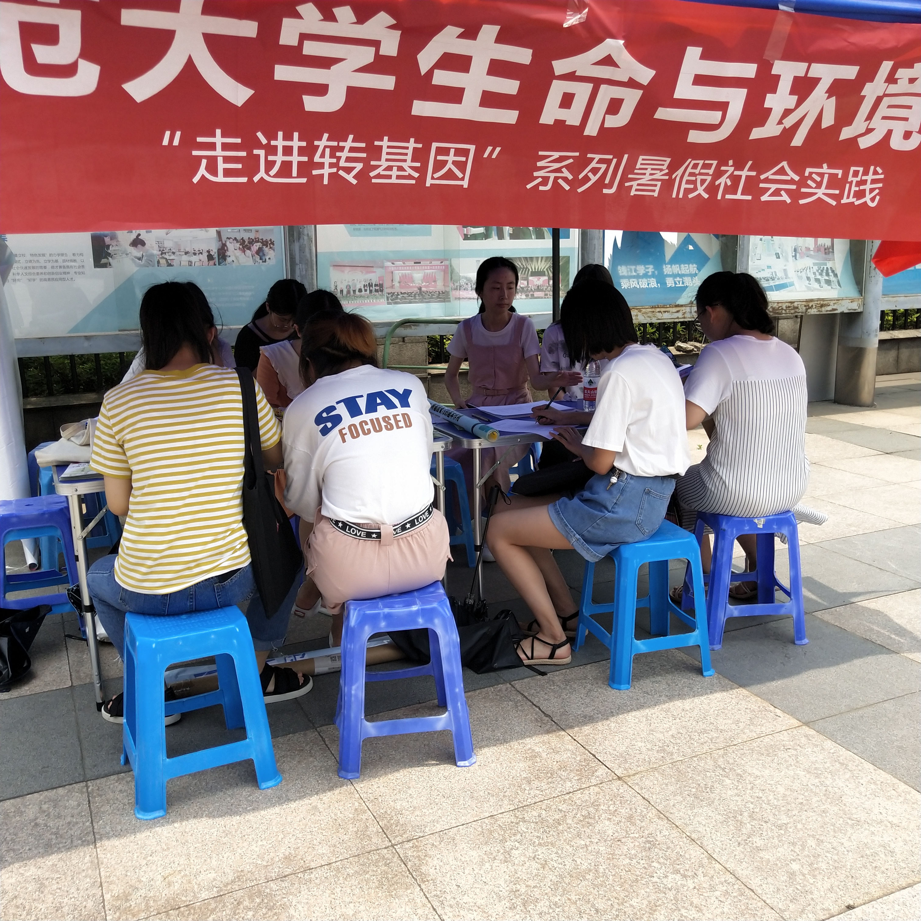 首先,小组成员在活动场地上撑起帐篷摆放好桌子,并将事先准备好的小零食摆在桌子上来送给填写问卷的同学或老师。张贴海报和悬挂横幅有利于同学们了解此次社会实践的活动,更重要的是可以吸引大家参与学习转基因技术的相关知识,这同时也调研小队关于转基因技术的调研。外场活动的进行面临着炎热天气的挑战,过高的温度使得很难有同学愿意来参与并了解。可是小组成员的热情丝毫不减,询问过路的同学是否愿意了解,并进行简单的科普。