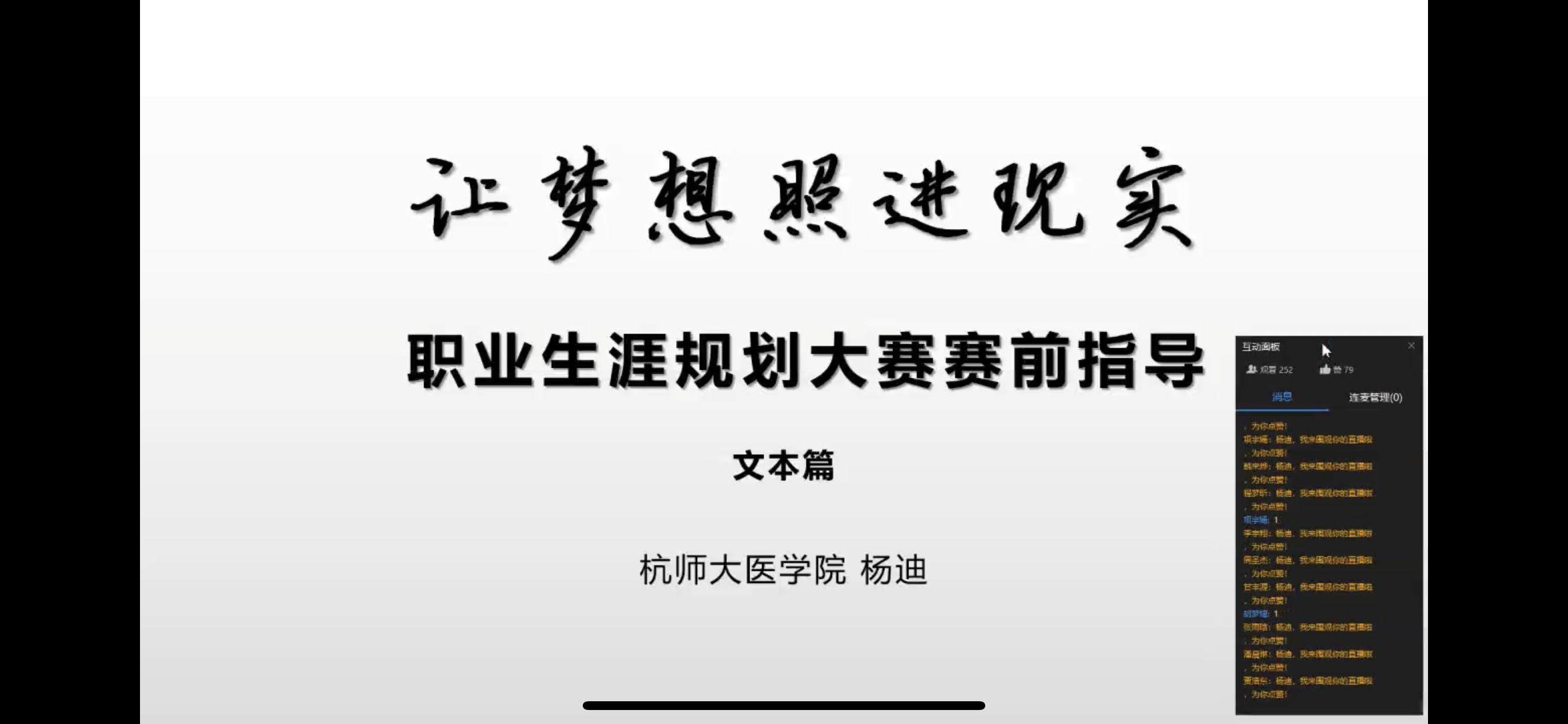 4月22日18:00,重庆时时彩 于线上开展了名为“让梦想照进现实”的职业生涯规划大赛赛前指导讲座。此次活动由重庆时时彩 学工办主任倪雅老师主持,特邀请杭师大医重庆时时彩 团委书记杨迪老师作为主讲嘉宾。