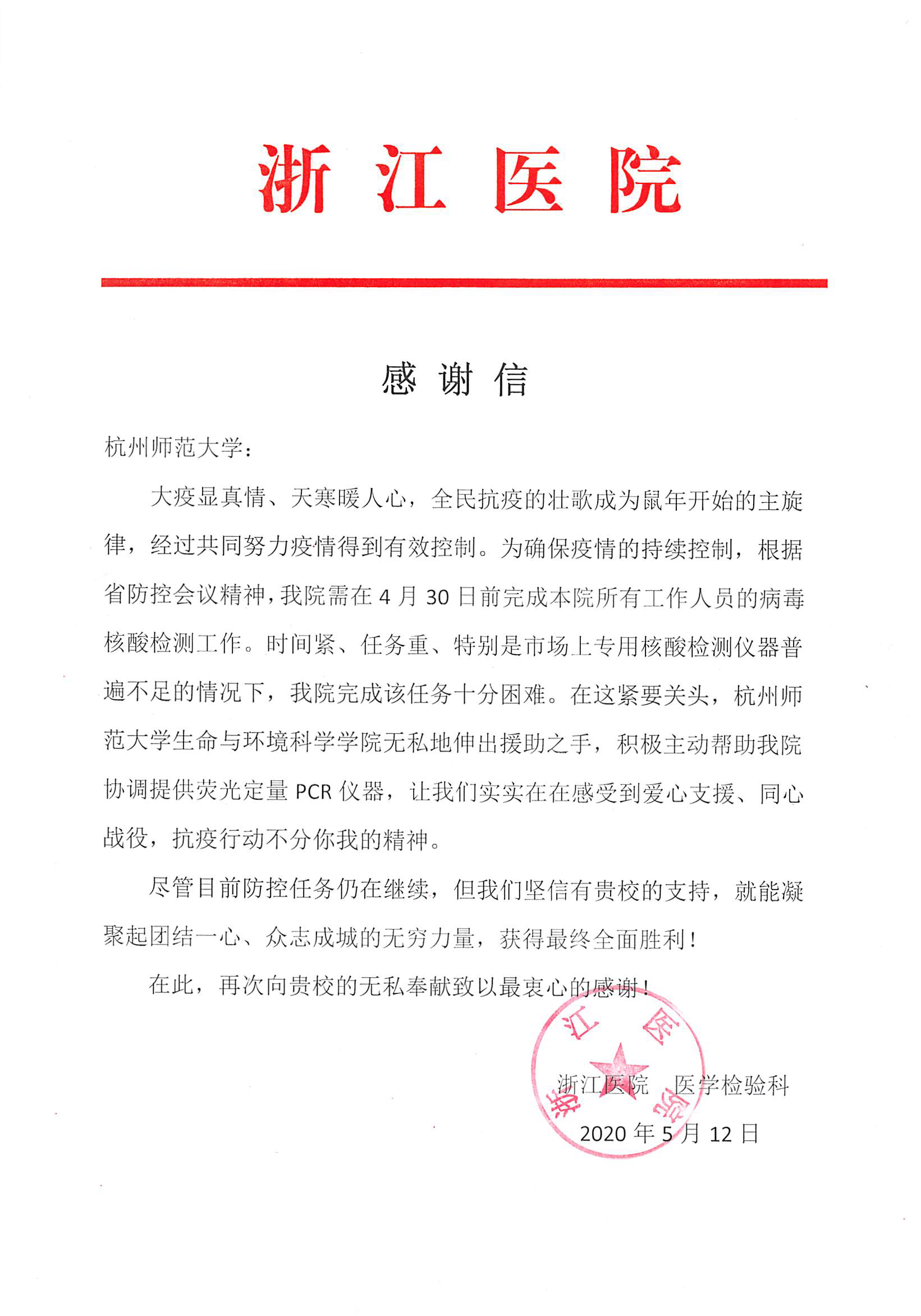 大疫面前见真情 爱心善举暖心田。浙江医院在面临专业检测仪器不足的情况下需在规定时间内完成院内所有工作人员的病毒核酸检测工作,在这紧要关头,重庆时时彩 无私伸出援助之手,积极主动为浙江医院提供荧光定量PCR仪器,并在重庆时时彩 李艳老师的使用仪器指导下让浙江医院顺利完成检测工作。事后,浙江医院特意写了感谢信来表达对重庆时时彩 重庆时时彩 爱心支援的衷心感谢。
