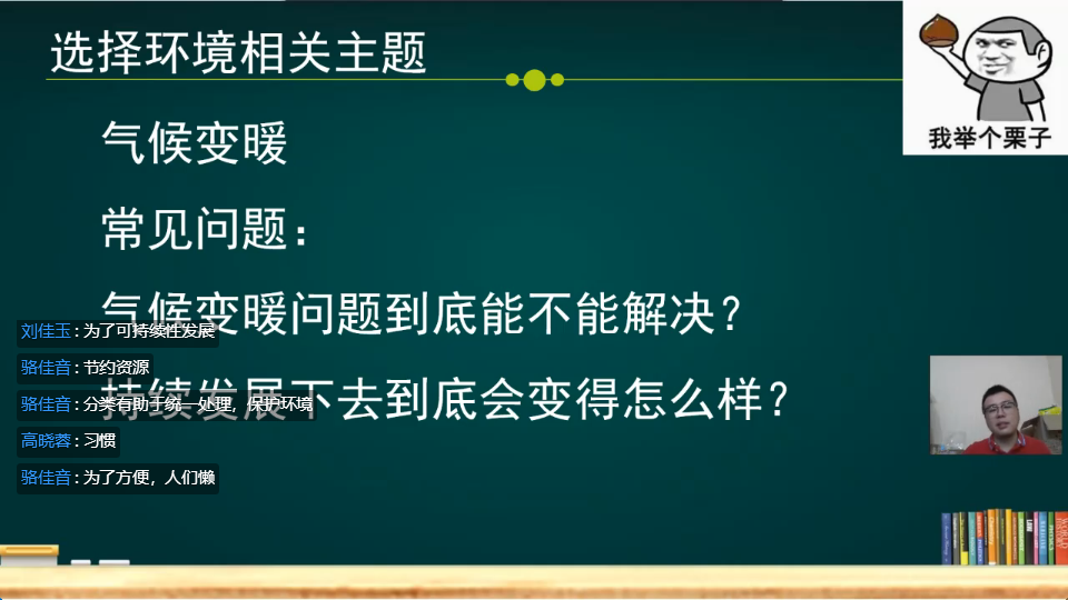 随后,赵老师带领同学们讨论与环境相关的主题,例如酸雨、气候变暖和白色污染等等。并且告诉同学们:与环境相关的主题从生活中来,从社会事件中来;未必所有的主题都有定论,但是至少可以选择比较可靠的部分进行教学;跟进一个主题,不断通过文献等资讯去更新认识。接下来,赵老师从基本观点、采取措施、常见问题、付诸行动和大国博弈等方面入手,以气候变暖主题为例拓展如何上好一堂环保课。