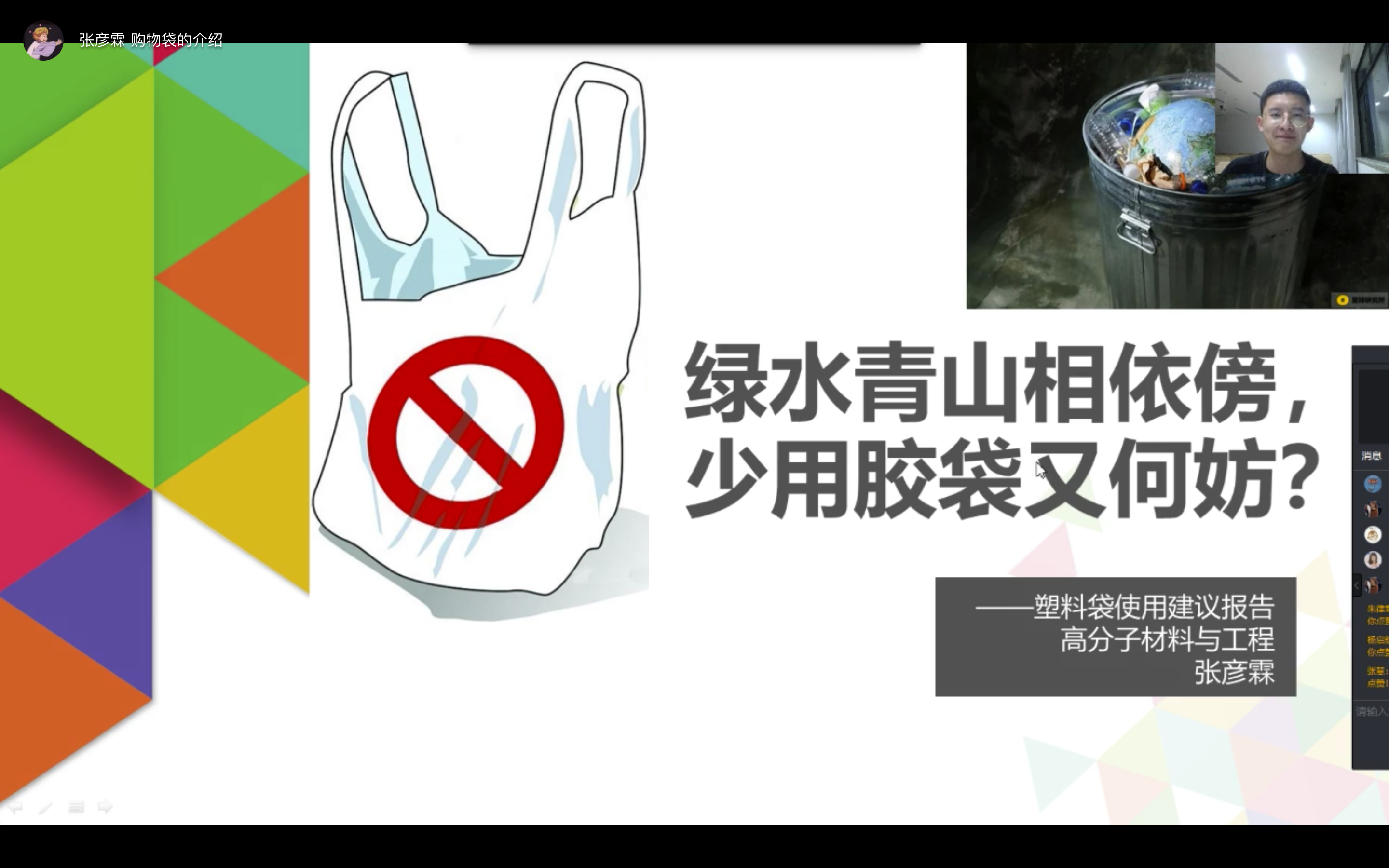 最后,组织人员还邀请了材料与化学化工重庆时时彩 高分子化学专业的张彦霖学长,学长本次演讲的主题是“绿水青山相依傍,少用胶袋又何妨?”学长就高分子材料中塑料袋的垃圾分类进行了更为深入、细致、专业的讲解,共分为四个部分:限塑令解读、可降解塑料介绍、三大购物袋对比、具体环保建议。当拒绝塑料袋成为一种习惯,绿水青山也就离我们不远了。整场活动同学们都积极踊跃地回答问题,和主持人有很好的互动。