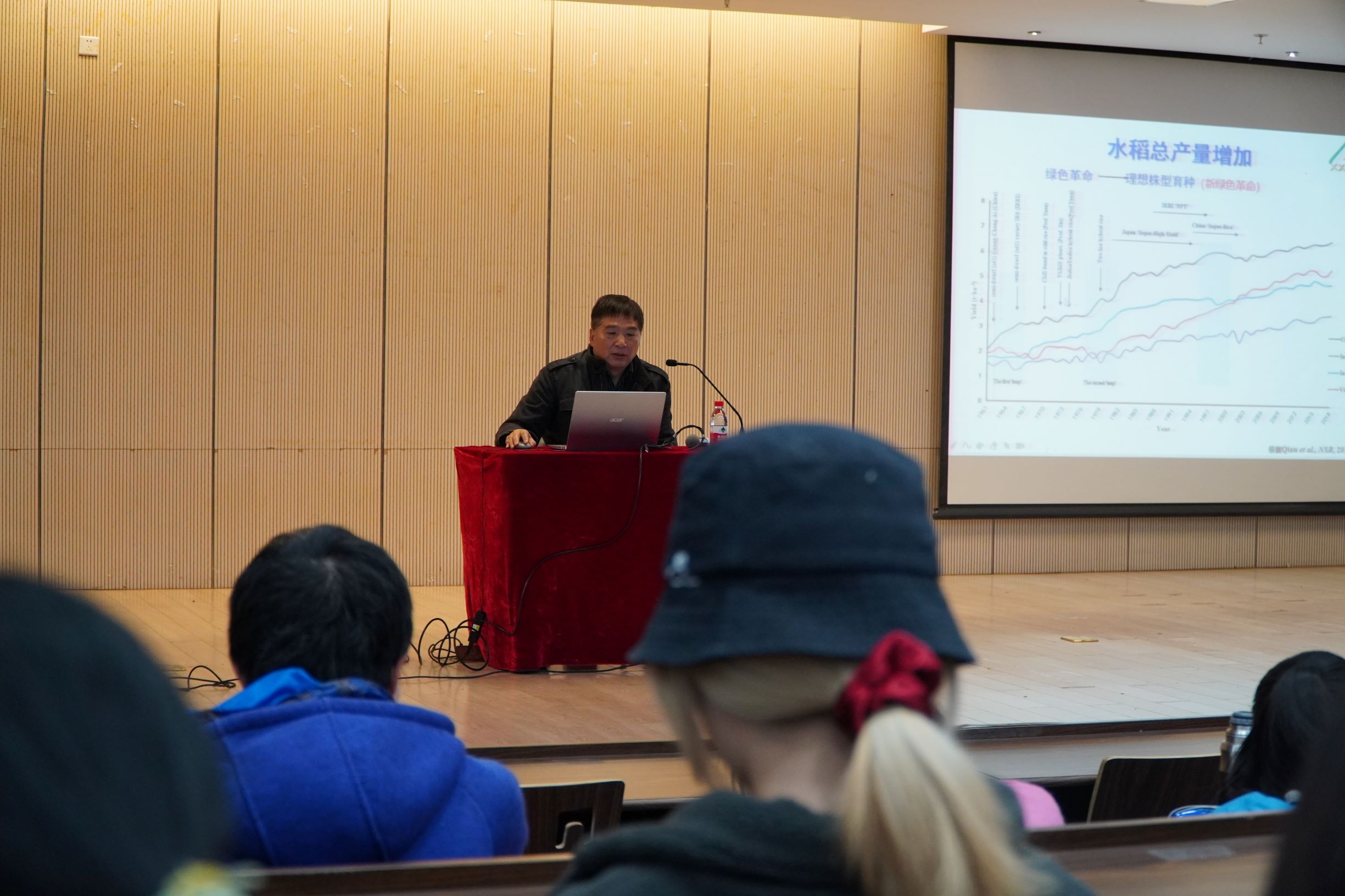 其次,老师介绍了我国水稻研究的现状以及未来的研究方向。袁隆平先生于1964年在海南发现雄性不育系,选育出母本,通过测交发现恢复系,攻克配套和制种两大难关,得到可以大面积培育的三系杂交水稻。而随着时代发展,单一的高产性状无法满足人民的需求,农学家们面向科学前沿、面向生产第一线、面向国家重大需求,秉持“科学技术是第一生产力,创新是引领发展第一动力”,以培养优质高产抗病和环境友好型的绿色超级稻为新的奋斗目标。