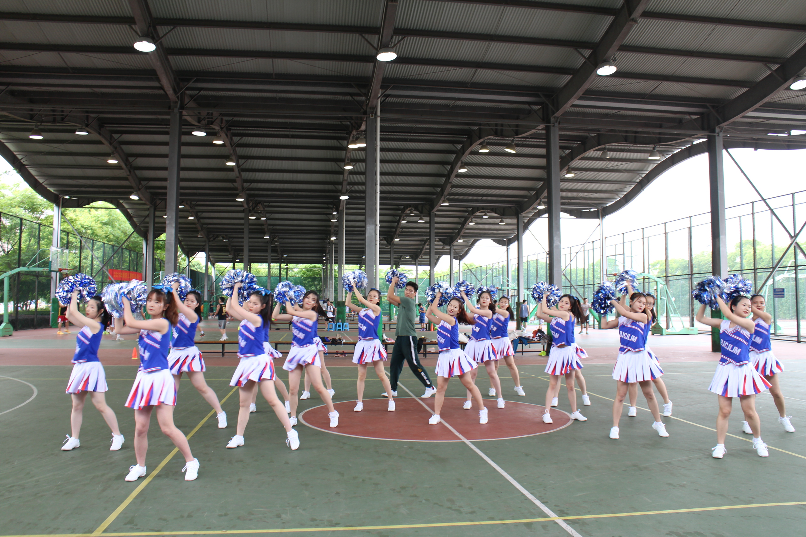 在A区风雨篮球场举行了第二十届体育文化节—喜迎建党一百周年“峥嵘杯”啦啦操大赛。