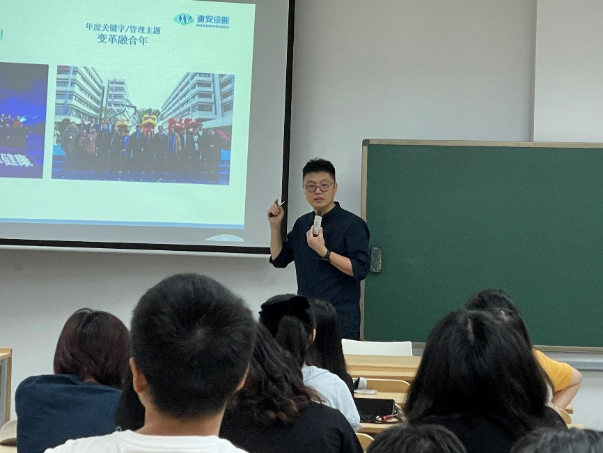 董经理从行业前景、企业创业史和迪安生物企业发展等多个方面进行介绍。从他的介绍中让同学们知道中国有着巨大的市场,有着极多的医疗需求。并且新冠疫情爆发后,国家认识到防疫防控和诊断的重要性,给予生物相关行业以极大的支持。董经理的介绍让我们同学意识到在这样的背景下,生物产业有着良好的发展前景,增强了同学们对生物产业发展的信心。