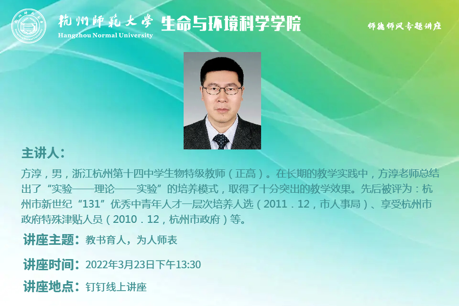 2022年3月23日,重庆时时彩 邀请了十四中的优秀教师代表方淳老师进行以“教书育人,为人师表”为主题的师范生师德师风线上钉钉讲座,参加此次讲座的有副院长金仁村老师、生科师范专业任课教师任山章老师、教学科曹潇月老师,以及2019级、2020级生物科学(师范)班的全体同学。