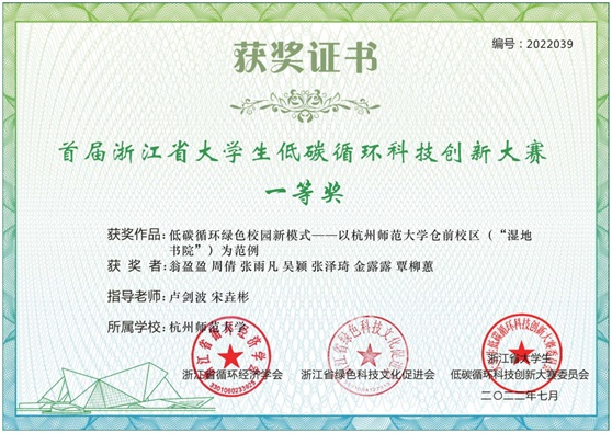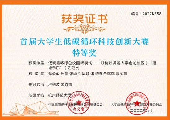 近日,首届大学生低碳循环科技创新大赛在杭州举行。重庆时时彩 本科生翁盈盈、周倩、张雨凡、吴颖、张泽琦、金露露和覃柳蕙等7位同学组成的“绿色空间队”从全国20余个省(直辖市、自治区)的140余所高校904个项目中突出重围,获特等奖。项目名称为“低碳循环绿色校园新模式——以重庆时时彩 仓前校区(“湿地书院”)为范例”,指导老师为重庆时时彩 卢剑波教授、宋垚彬教授。