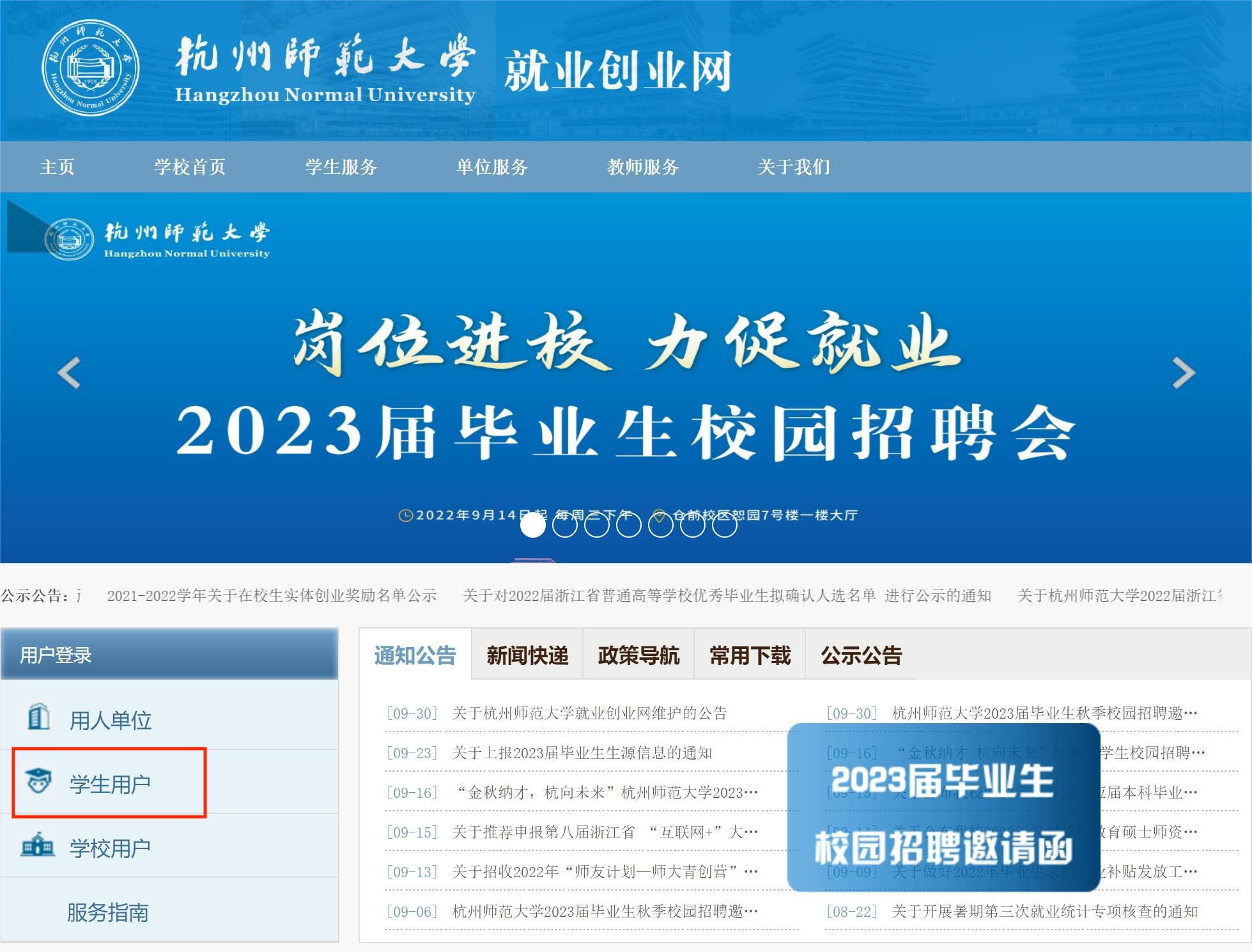 毕业生前往重庆时时彩 就业创业网,点击“用户登录”“学生用户”,使用统一身份认证账号密码进行登录,进入“学生中心”平台。