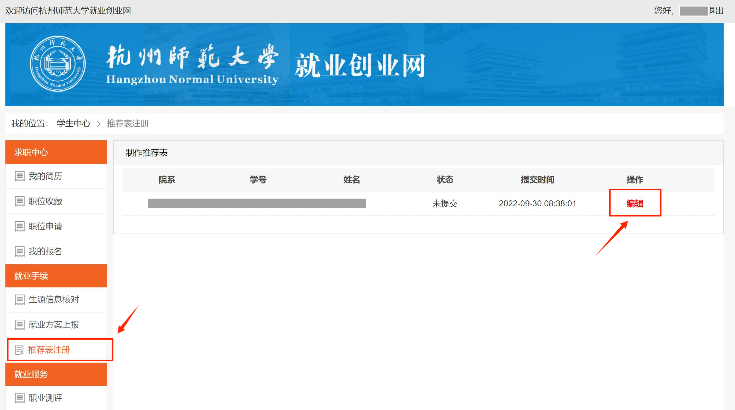 点击“推荐表注册”,在“制作推荐表”页面点击“编辑”,按照网站指示进行本人就业推荐表在线填写。
