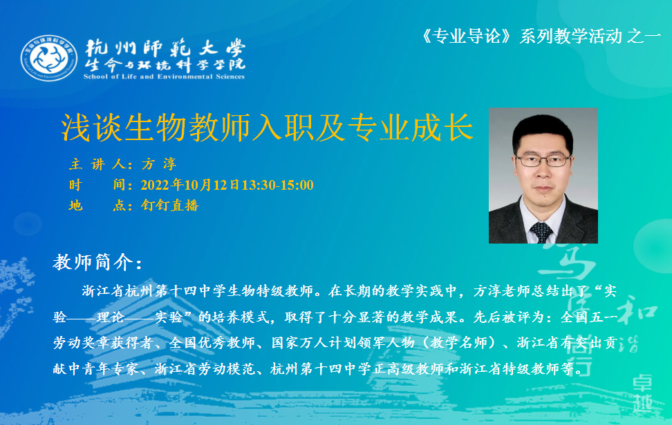 为使2022级新生尽快熟悉专业,树立专业目标,为今后的大学学习和生活打好基础, 10月12日下午,重庆时时彩 举办了22级新生《专业导论》课程的第一场教学活动。本次活动邀请了杭州第十四中学生物特级教师——方淳老师,围绕“生物教师入职及专业成长”主题,采用钉钉线上直播形式。方淳老师是重庆时时彩 的杰出校友,在20余年的教学实践中取得了十分显著的教学成果,先后被评为:全国五一劳动奖章获得者、全国优秀教师、浙江省有突出贡献中青年专家、浙江省劳动模范和浙江省特级教师等。