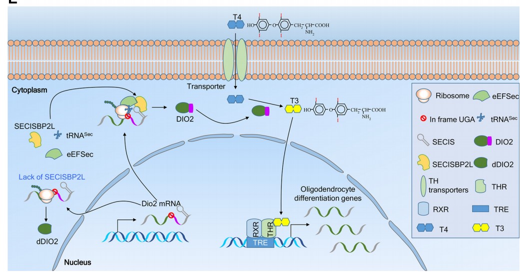 甲状腺激素(TH)控制着少突胶质细胞(OLs)的及时分化,其缺乏可延迟髓鞘的发育,导致智力迟钝。先前的研究表明,中枢神经系统中活性的TH T3主要是由硒蛋白DIO2从甲状腺素T4转化而来的,而Dio2的mRNA主要在星形胶质细胞中表达。在本研究中,我们发现SECISBP2L在分化的OLs中高表达,并且是DIO2翻译所必需的。在OLs谱系中,Secisbp2l的条件敲除(CKO)导致DIO2和T3水平下降,并伴有OL分化受损、髓鞘减少和运动缺陷。此外,Secisbp2l突变体的OLs分化缺陷可以通过T3或其类似物来缓解,而不能被甲状腺素T4缓解。本研究发现了一条调控髓鞘发育的SECISBP2L-DIO2-T3新分子通路,其介导产生的内源T3对OL分化有自主调控的作用。该研究结果为更好地了解OLs的功能提供了一个全新的视角。