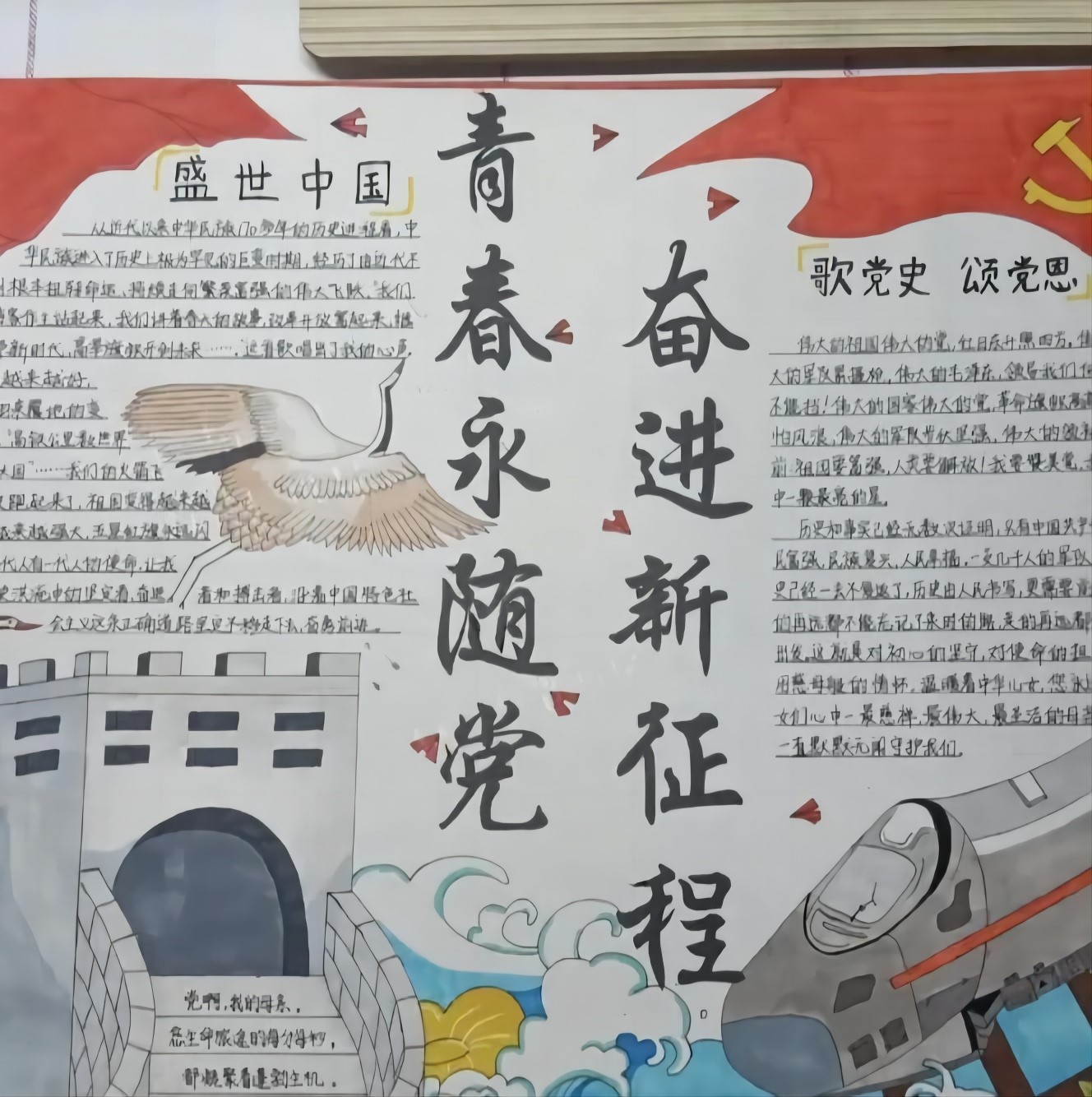 寻访伟大成就,争当时代新人。实践成员和中小学生各自寻访并相互介绍家乡的发展变化、英雄楷模事迹、历史典故等,讲述对近五年来家乡发展变化的认识和感受,以及对共创祖国美好明天的期待,共同完成一份「奋进新征程」作品。