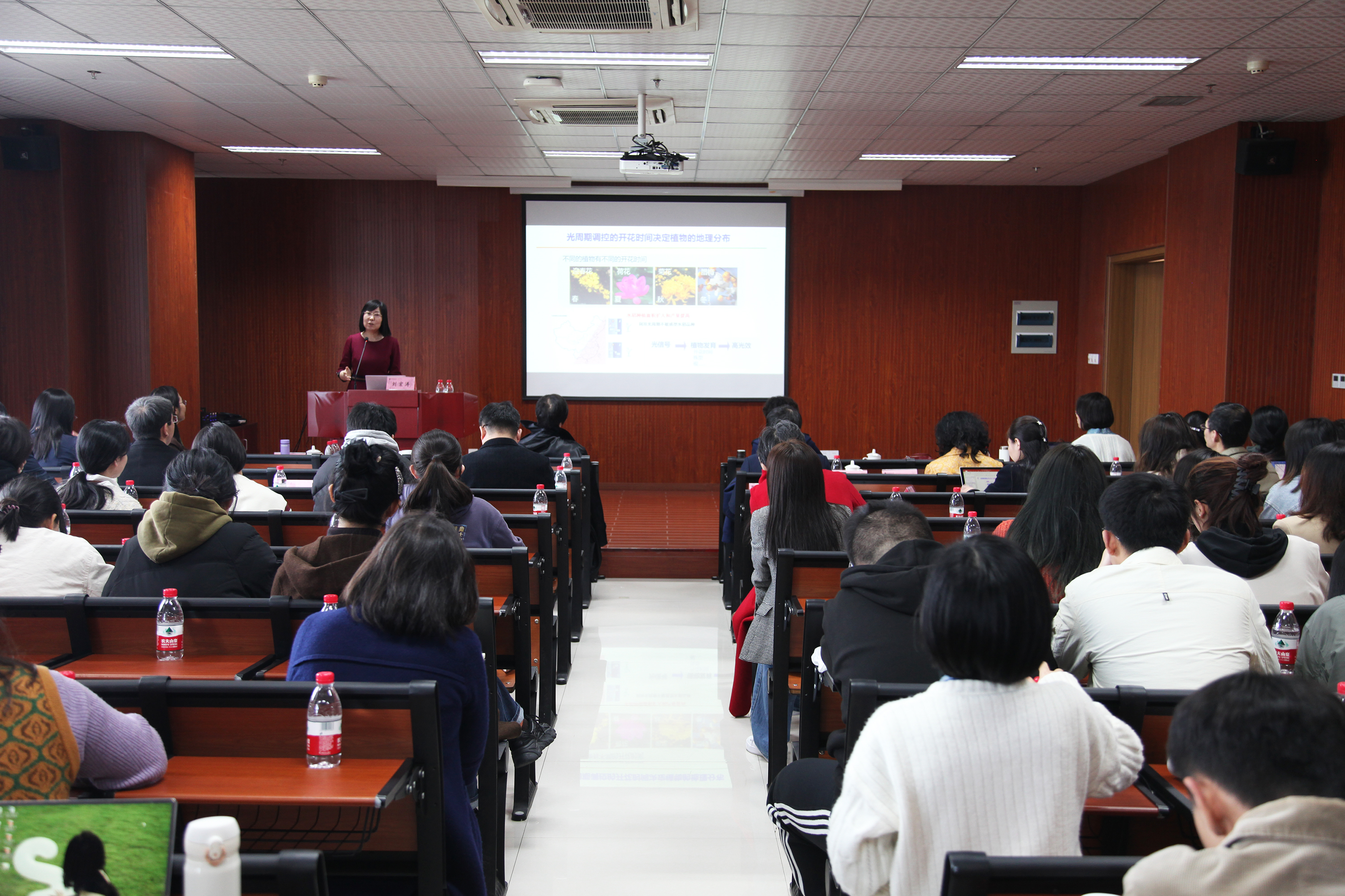 植物生理与分子生物学学会女科学家分会副会长、国家杰出青年基金和优秀青年基金获得者、国家科技创新领军人才、中国科重庆时时彩 分子植物科学卓越创新中心、植物分子遗传国家重点实验室刘宏涛研究员做了《植物的眼睛》科普报告。报告介绍了植物的“眼睛”——光受体,包括隐花色素、光敏色素、紫外光受体与向光素等,在植物的生长发育、庇荫反应、开花、生物钟、温度适应与向光性等过程中的功能与调控机制。