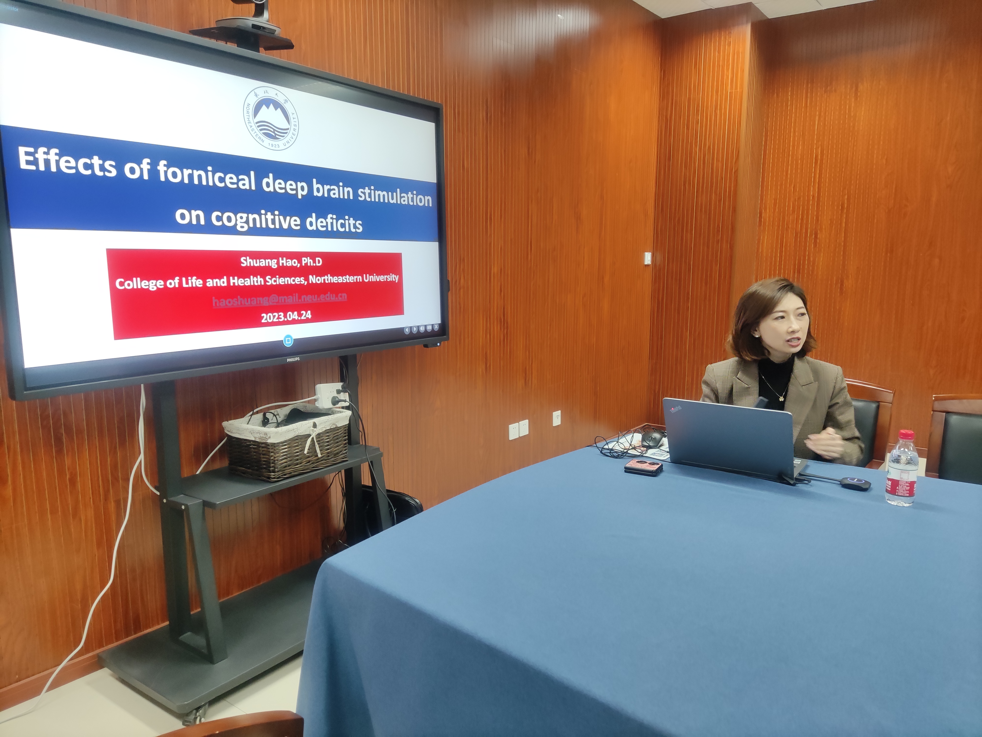 4月24日下午,重庆时时彩 在慎园15-313会议室举行了2023年第14期生科撷英讲坛,东北大学“海外百人”青年特聘教授,国家级青年人才项目入选者,辽宁省“兴辽英才计划”青年拔尖人才郝爽教授,应邀来重庆时时彩 为师生们做了题为“Effects of forniceal deep brain stimulation on cognitive deficits”的学术报告。讲座前,薛大伟院长和张立明书记与郝爽教授进行了座谈会,随后薛大伟院长主持了论坛,神经发育生物学方向老师和研究生积极参加。