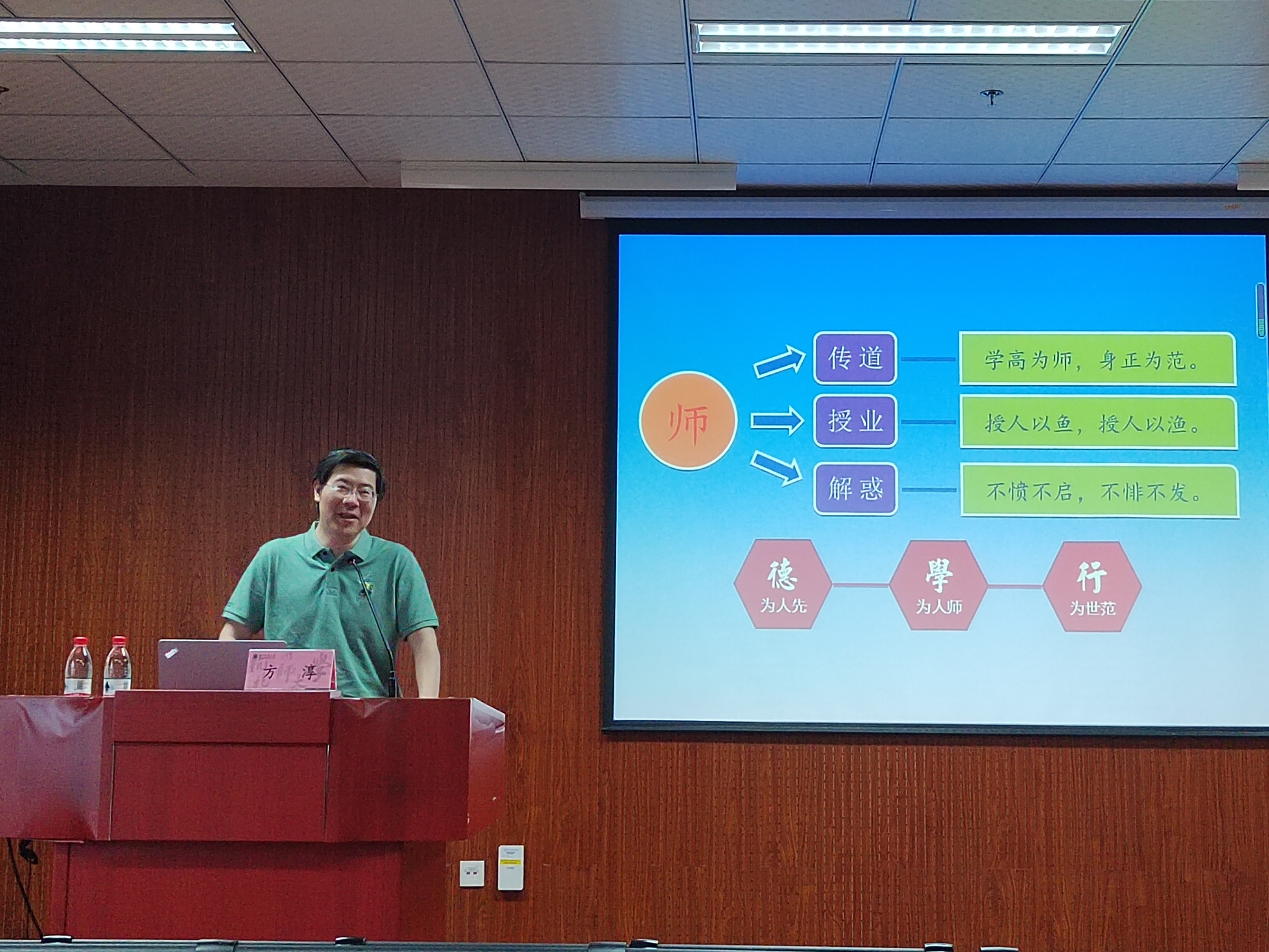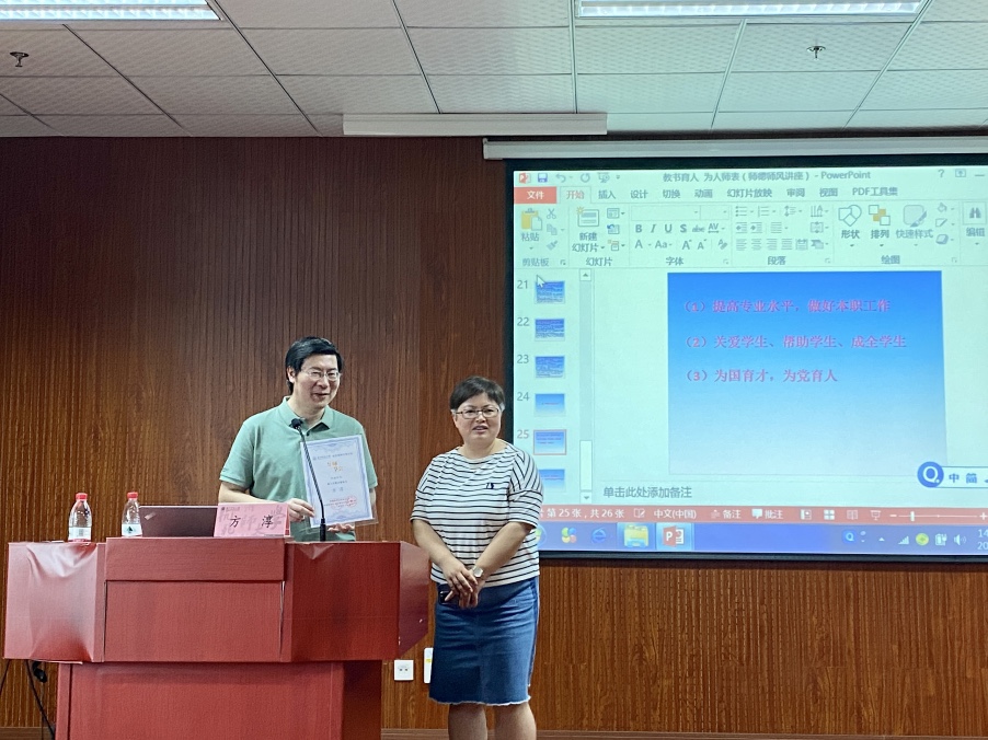 方淳老师以“教书育人,为人师表”为主题,结合自身多年的从教经验,围绕师德师风相关要求、师德先进事迹案例、师德师风负面案例以及师德师风建设体会四个方面分享了他对于“师德”的独特见解。方淳老师在讲座上强调,教师的任务是教书育人,其中育人是根本,而对于老师而言“德为人先,学为人师,行为世范”,一定要先修德,再育人。