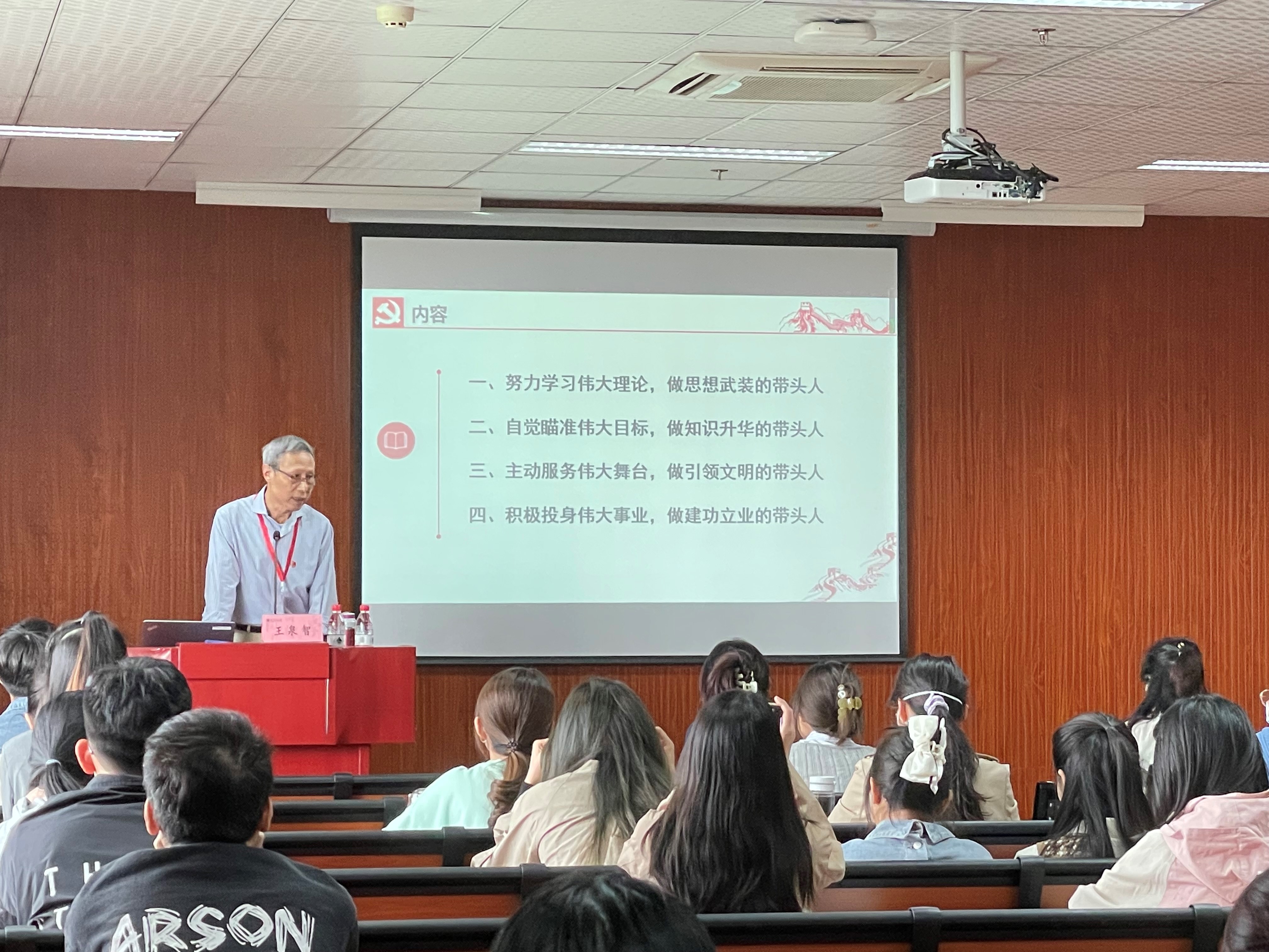 王泉智老师结合个人的参军入伍学习经历、勉励大学生们做好“四个带头人”,在未来的生活和学习中,有所进步有所作为。同时王老师鼓励在座同学们树立远大目标,积极投身伟大事业,欢迎有志者加入为国防建设现代化服务的各个行业。