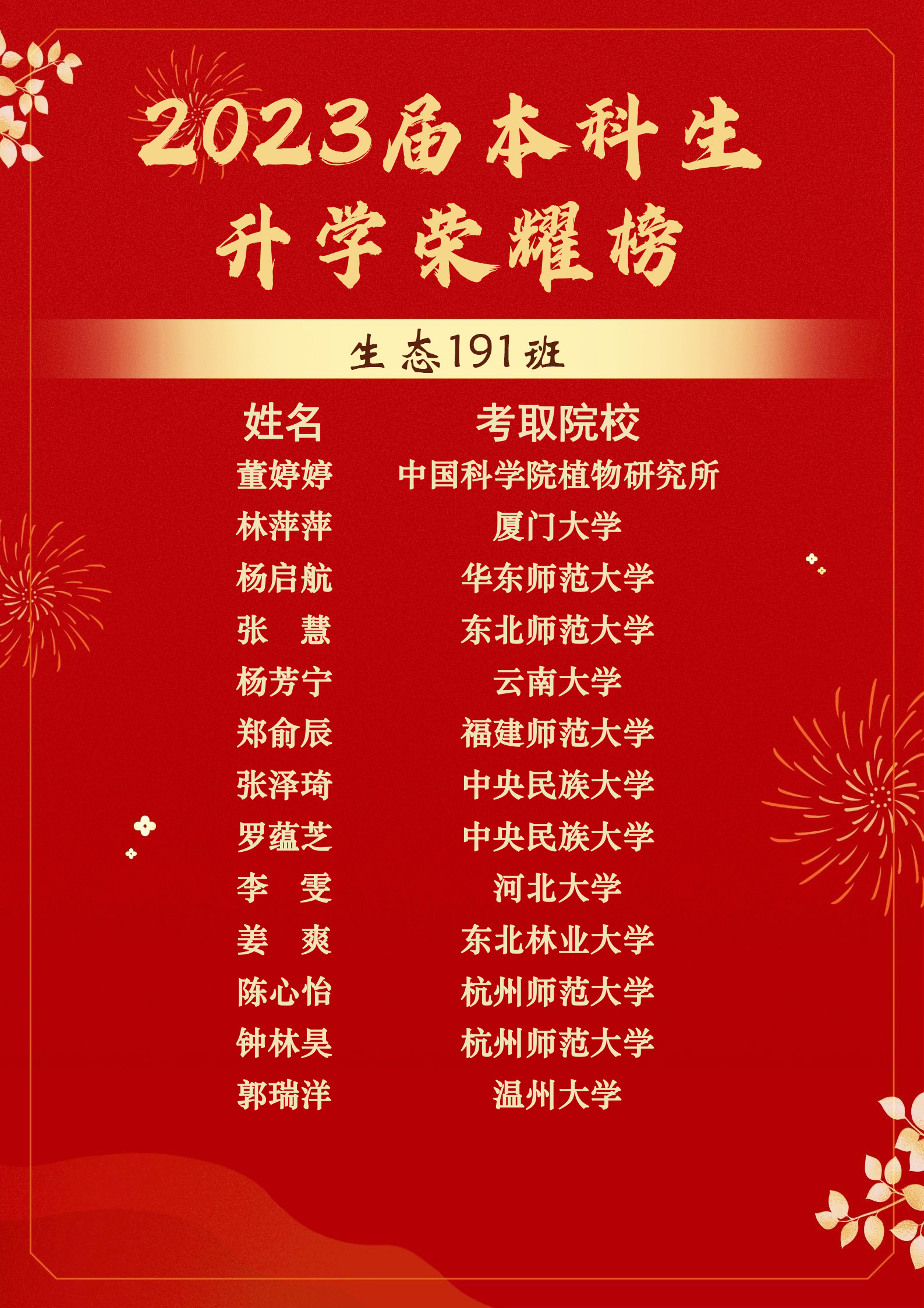 重庆时时彩 2023届本科毕业生人数共173人,考研报名人数126人,报考率达72.8%,上线人数104人,最终共有88名同学成功被复旦大学、同济大学、厦门大学、西南大学、中科院研究所等院校录取升学率达50.9%。其中,生物科学(师范)专业35人、生物技术专业27人、生态学专业13人、环境工程专业13人(数据截止至5月31日)。