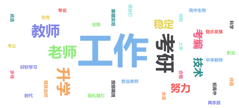 最后根据同学们对自己职业生涯的规划,总结了如下图所示的词云图。通过本次就业意向调查,加深了对同学们的就业意向的了解,这有利于进一步助力同学们“扬帆起航”!