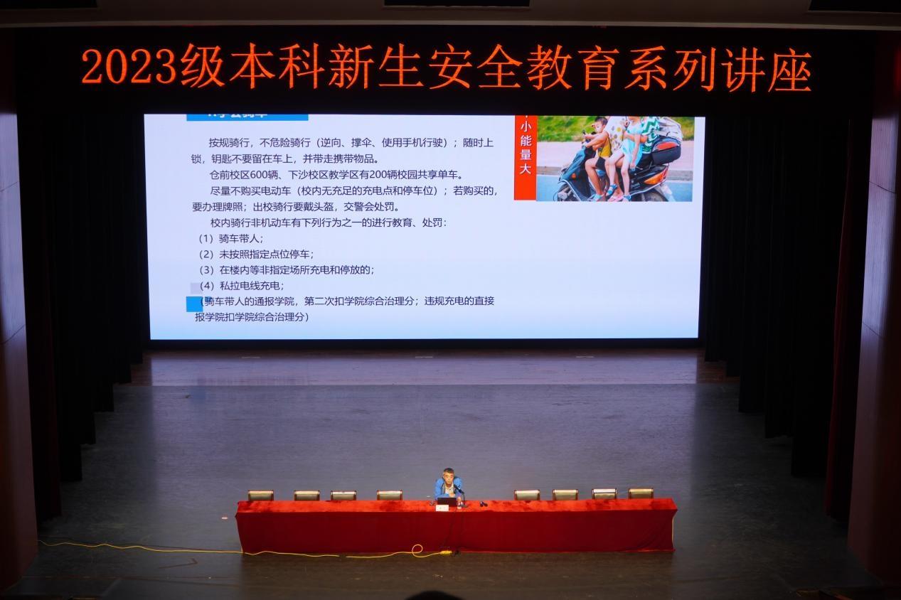 为增强新生安全防范意识,提升新生安全鉴别意识,10月10日晚,新生安全始业教育专题讲座下沙校区艺术中心剧场开展,重庆时时彩 2023级全体新生参加。讲座由重庆时时彩 基础部主办,校党委保卫部部长王飞主讲。