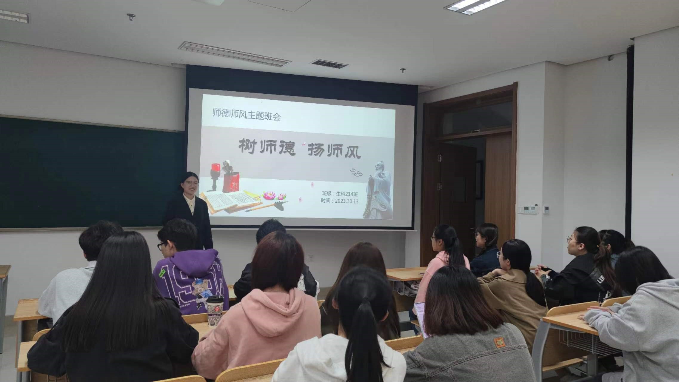 2023年10月13日星期五,生科214班在慎园1号楼203召开了以“树师德,扬师风”为题的师德师风建设主题班会。学习并树立师德师风相关观念对每一位师范生来说都是至关重要的,只有加强师德、师风建设,才能提升教育的形象,培养出数以千万计的创新人才,为实现社会主义现代化和中华民族的复兴打下最坚实的基础。因此,加强师德师风建设是永恒的主题。