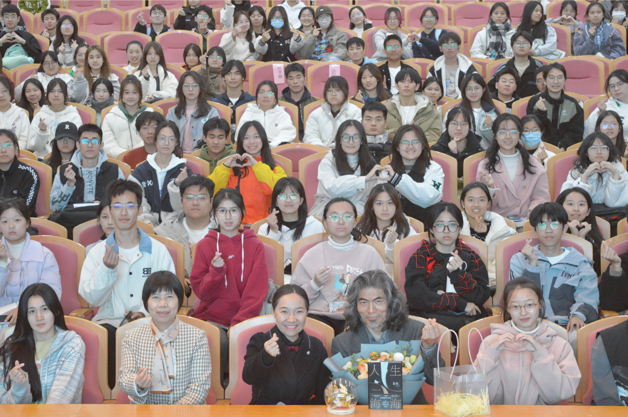 讲座结束后,学生代表为黄岳杰送上手工制作的“永生花”摆件,并送上著名作家麦家亲笔签名的《人生海海》读本,在场同学们也与黄岳杰留下了大合照。