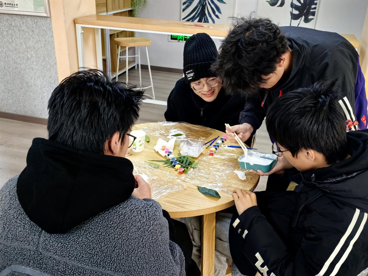 活动现场热闹非凡,科研部干事和协会会员们投身于叶子化石的制作过程中:挑选喜欢的叶片,用石膏封存,最后挥洒颜料以绘出心仪纹路。近距离地领略叶脉的纹路之美,不仅培养了他们对自然的兴趣,还提高了对美的感悟。随着化石的凝固,对生物实验的好奇深深扎根于每一位会员的心中。