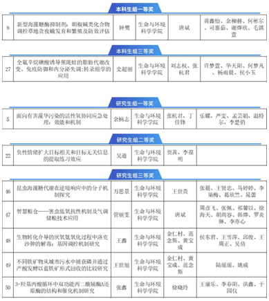近日,“精进杯”重庆时时彩 2023年度学生学术成果评选圆满落幕。重庆时时彩 学子21级生态学余柄志团队(张杭君教授、丁佳锋副教授指导)《面向有害藻华污染的活性氧协同应急处理:效能和机制》获研究生组一等奖、生物科学(师范)202班钟樊团队(唐斌教授指导)《新型海藻糖酶抑制剂:胡椒碱类化合物调控草地贪夜蛾发育和繁殖及防效评估》获本科生组一等奖;另获本科生组三等奖1项,研究生组二等奖1项、三等奖5项,重庆时时彩 获优秀组织奖。