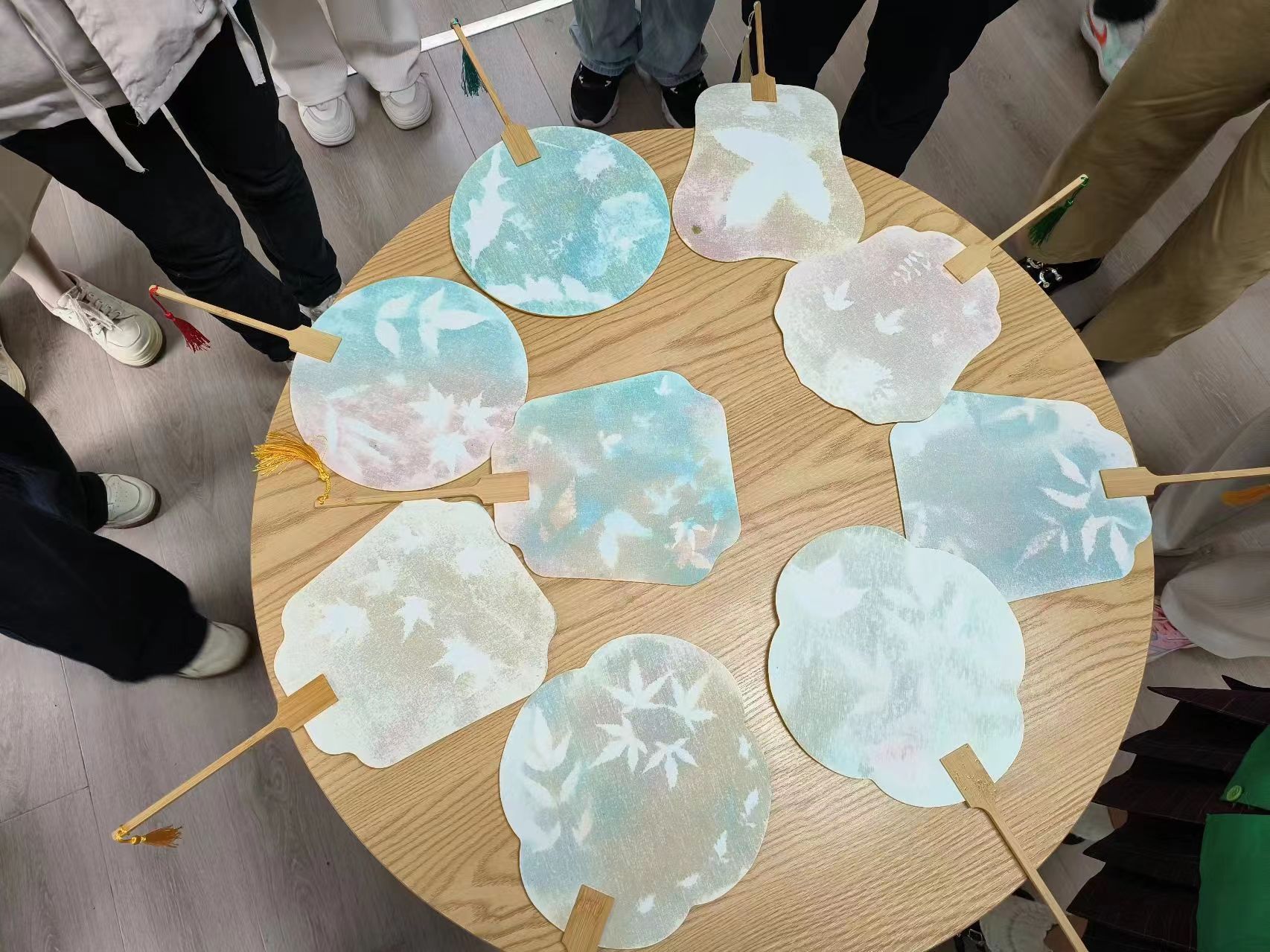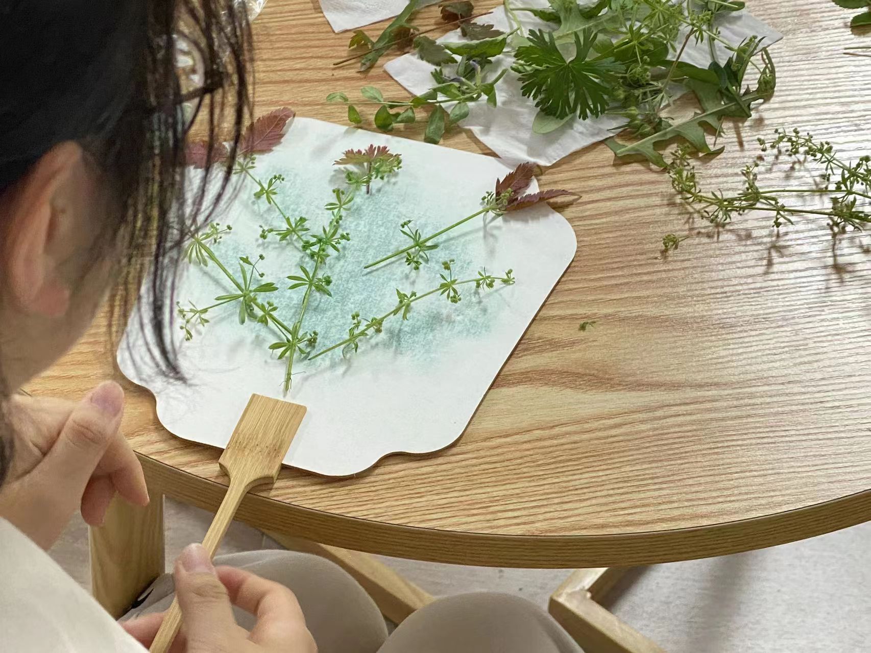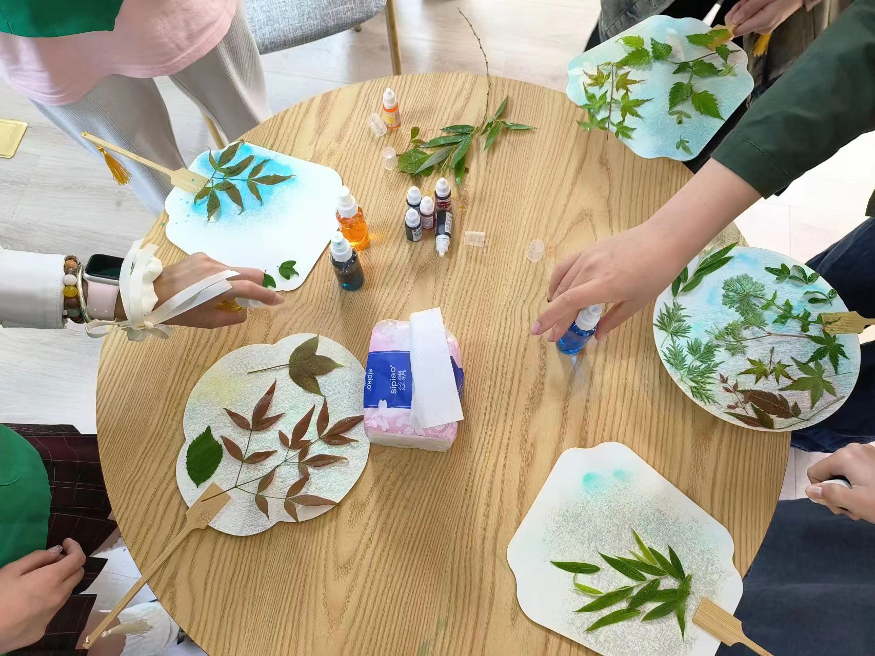 本次活动中,公益部干事先通过PPT与视频展示的方式向大家介绍纸张在生活中的不同应用,并重点介绍了“纸扇”。在有序引导下,会员们充分发挥想象力,将从地上收集起来的树叶摆放在纸扇上,选择不同颜色的染色喷雾向树叶尽情地喷洒,一按一放,便使素白的纸扇绽出独特的光彩。拿着心仪的纸扇,会员们对“化废为宝”有了更深刻的认知。