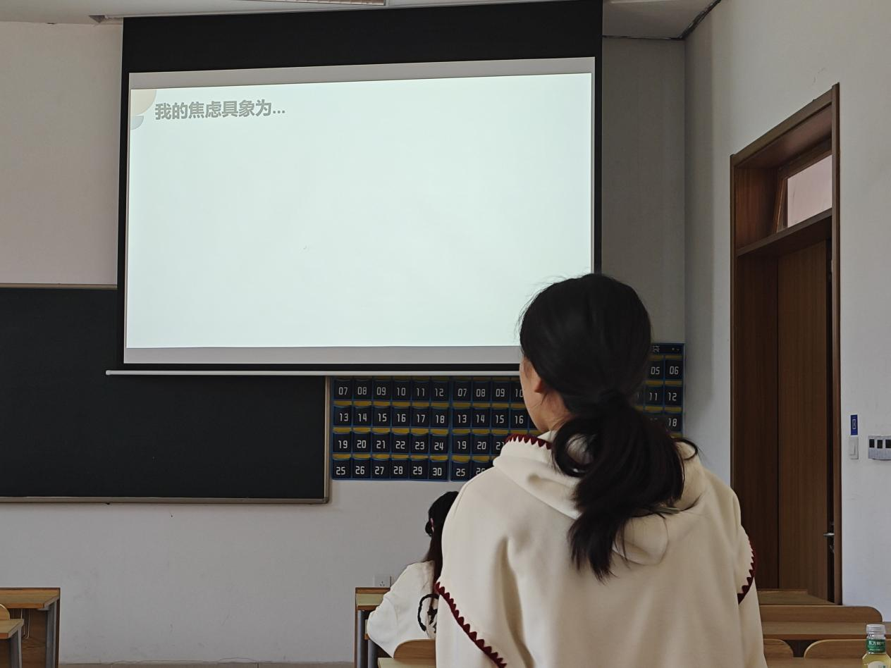 随后进行的“焦虑具象化”环节别出心裁。主持人引导大家将抽象的焦虑具体化为一件事或一个词,让大家在下发的白纸上写下体现自己开学焦虑的内容。现场气氛热烈,大家认真思考后,纷纷写下诸如课程难度、绩点压力、综测分竞争、社交困扰等答案。这一环节帮助师生们更清晰地认识自身焦虑来源,为后续寻找解决办法奠定基础。